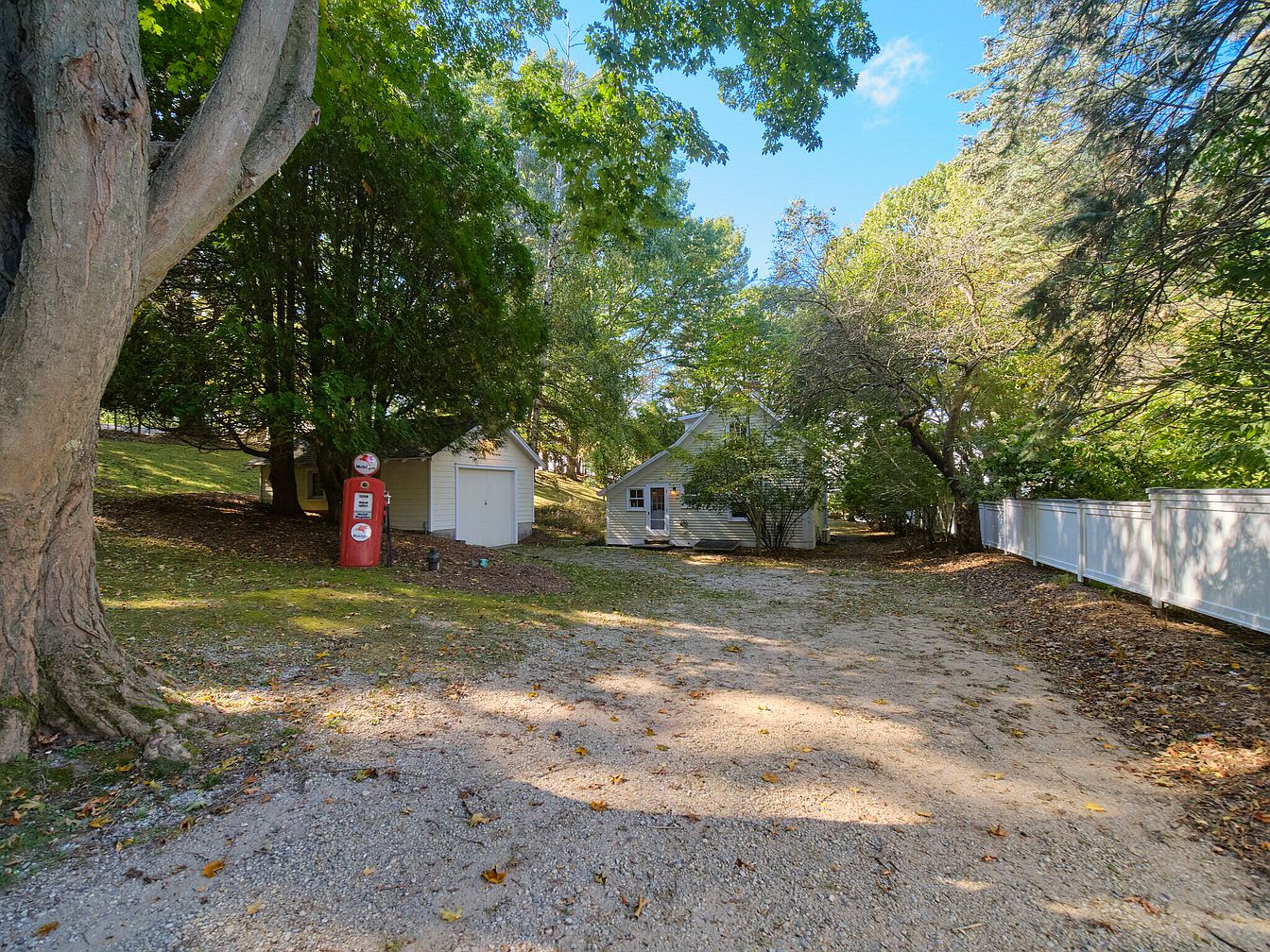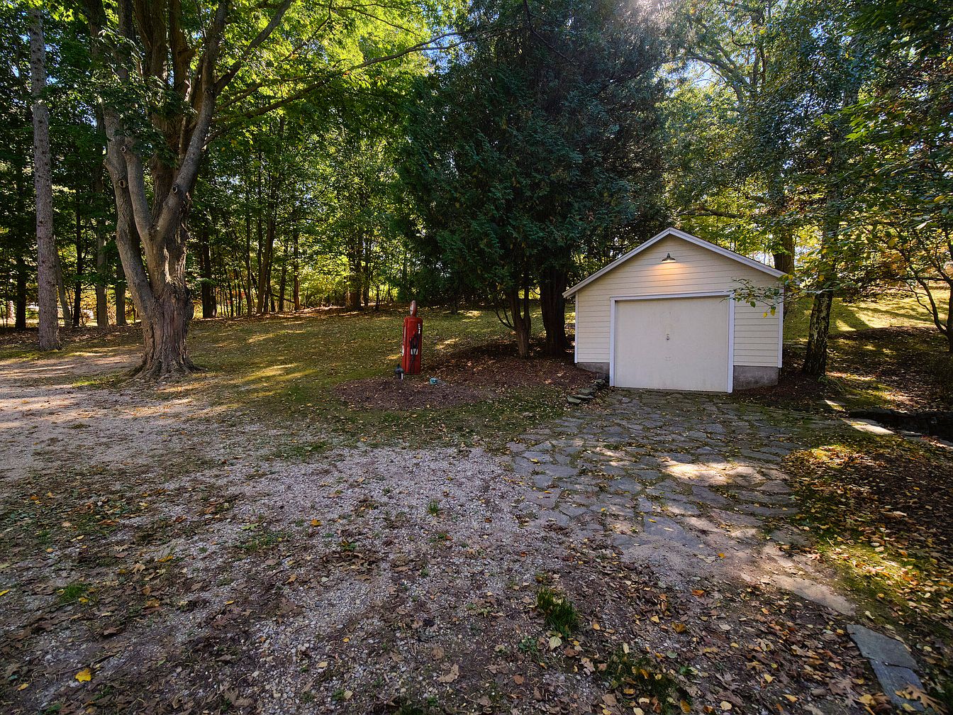 A gravel driveway leads to a quaint historic home, surrounded by a lush canopy of vibrant green trees. On the left, a classic red gas pump adds nostalgic charm, emphasizing the rustic ambiance. The house features white siding, complementing the natural surroundings. A small white shed is positioned nearby, contributing to the property’s functionality. The yard is dotted with fallen leaves, hinting at the autumn season. A white picket fence encloses the space, providing a sense of privacy while enhancing the aesthetic. Sunlight filters through the trees, creating playful shadows across the ground.