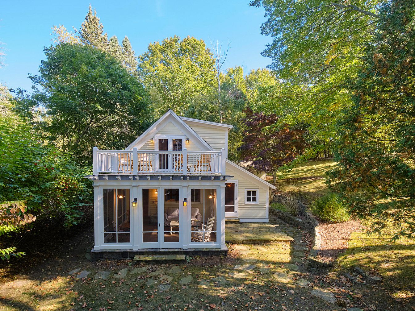The image shows the rear exterior of a charming historic home, accentuated by a spacious balcony. Sunlight streams onto the light-colored wooden siding, which contrasts beautifully with the lush greenery surrounding the property. The screened-in porch features large glass windows and comfortable seating, inviting relaxation while enjoying the outdoor scenery. The stone pathway leads to the entrance, framed by a variety of mature trees and shrubs that enhance the natural aesthetic. Architectural details, like the gabled roof and decorative railings, add character, emphasizing a blend of nature and cozy indoor living.