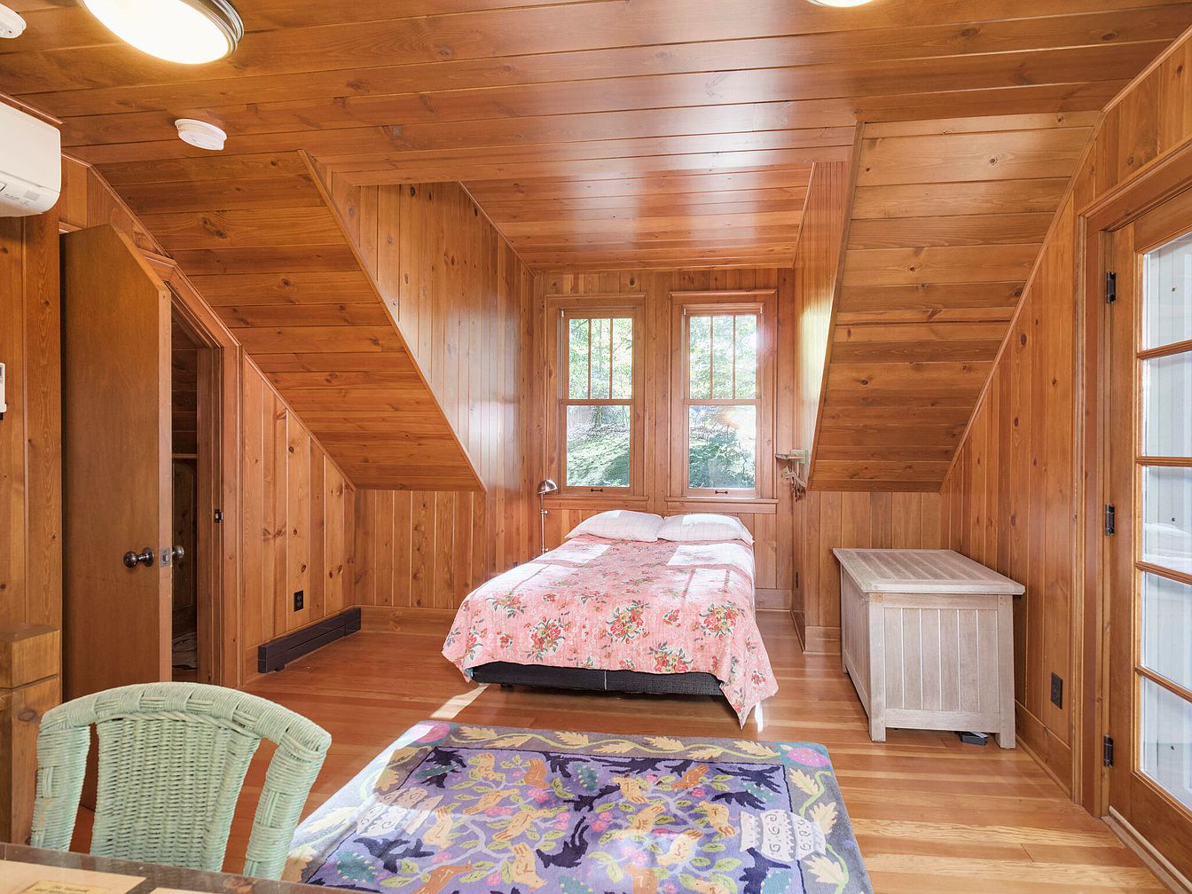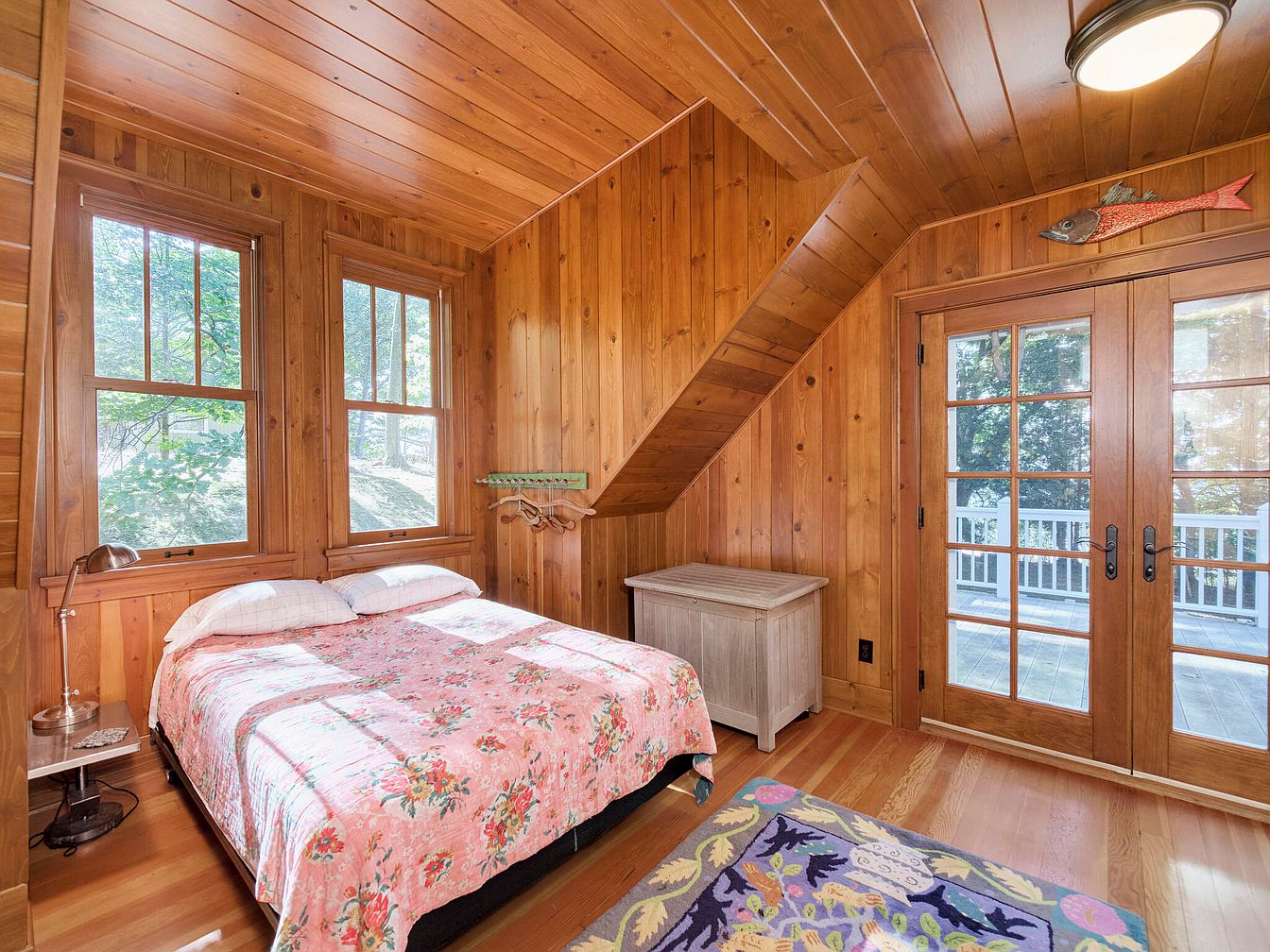 This cozy bedroom features warm wooden paneling on the walls and ceiling, creating an inviting atmosphere. Natural light floods the space through two large, double-hung windows, accentuating the rich tones of the wood. A full bed dressed in a vibrant floral quilt occupies the center, while a small side table with a lamp provides ambient lighting. A colorful rug with intricate patterns adds a playful touch to the hardwood floor. Near the bed, a chest offers functional storage, and double French doors lead to a porch, seamlessly connecting indoor and outdoor spaces, enhancing the room’s charm.