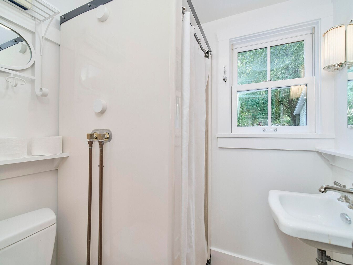A compact bathroom features a clean, minimalist design characterized by bright white walls and polished fixtures. A small sink with a stylish faucet sits beside the shower area, designed with a translucent curtain for privacy. A window allows natural light to flood the space, framed by classic white trim, showcasing lush greenery outside. The arrangement includes a modern toilet and a narrow shelf for essentials. Architectural details such as a vintage-style light fixture add charm, while exposed plumbing pipes introduce an element of industrial design, creating a balanced ambiance of elegance and functionality.