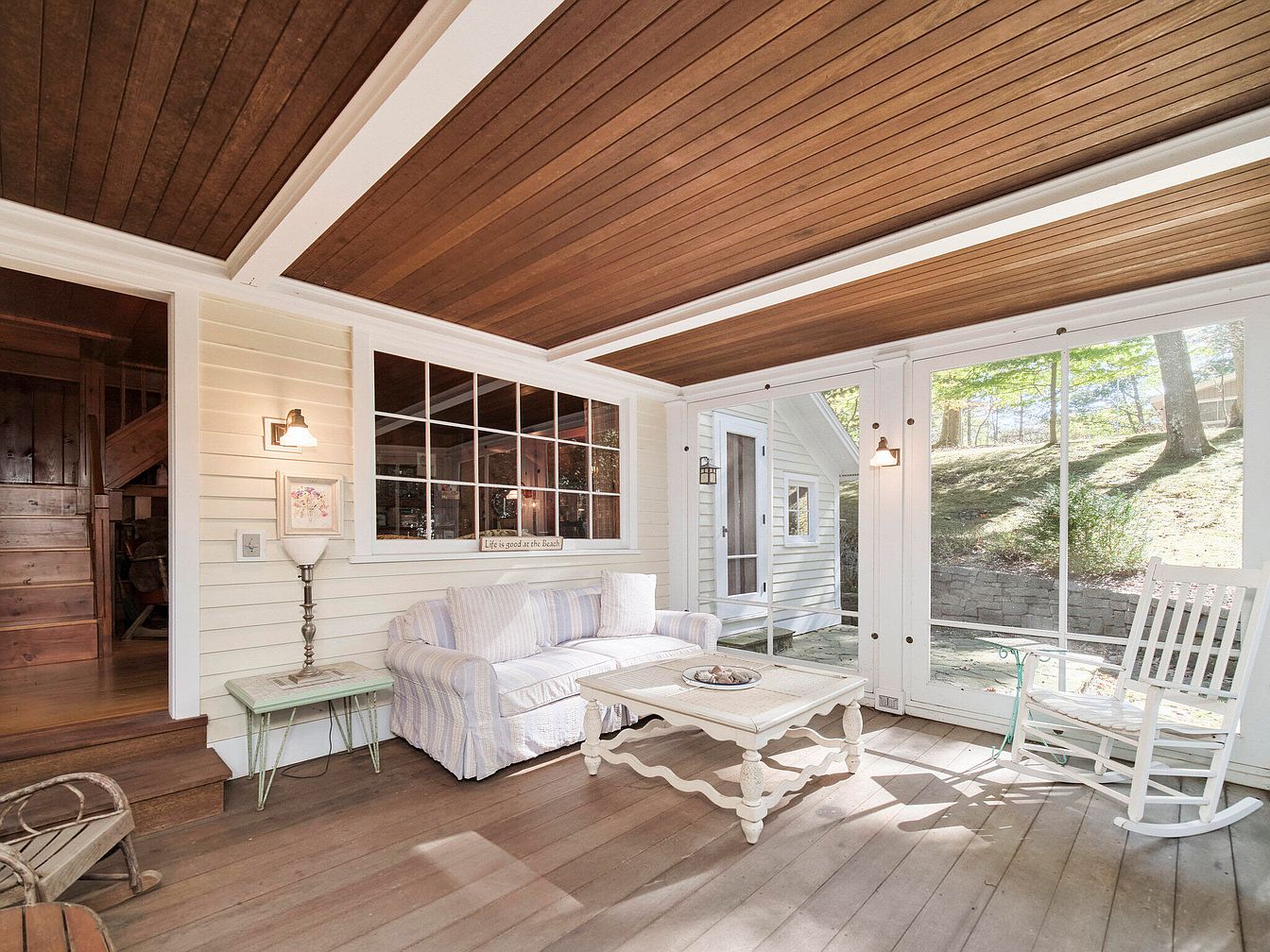 This sunroom features a blend of natural light and cozy furnishings, fostering a welcoming atmosphere. The ceiling showcases rich wooden beams, enhancing warmth, while light-colored walls give a bright, airy feel. A plush, striped sofa invites relaxation, complemented by a rustic wooden coffee table adorned with decorative items. Adjacent, a white rocking chair adds to the charm, ideal for leisure. Large glass sliding doors provide access to the outdoors, where natural scenery is visible, creating a seamless connection between indoors and nature. Subtle lighting fixtures add functionality while emphasizing the room’s inviting character.