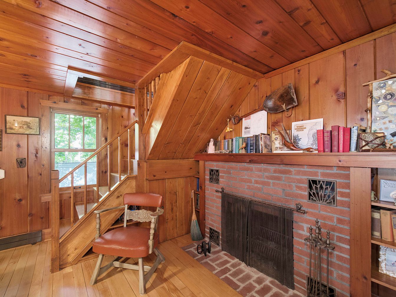This cozy living room features warm wood paneling and ceiling beams, enhancing its rustic charm. The staircase with wooden railings leads up, inviting exploration. A brick fireplace, complete with decorative ironwork, serves as a focal point, surrounded by a low brick hearth. A wooden shelf above the fireplace displays an assortment of books, framed photos, and decorative items, adding a personal touch. Natural light filters through a large window, accentuating the warm color palette of browns and earthy tones. A unique wooden chair with a red seat provides seating, blending practicality with aesthetic appeal.