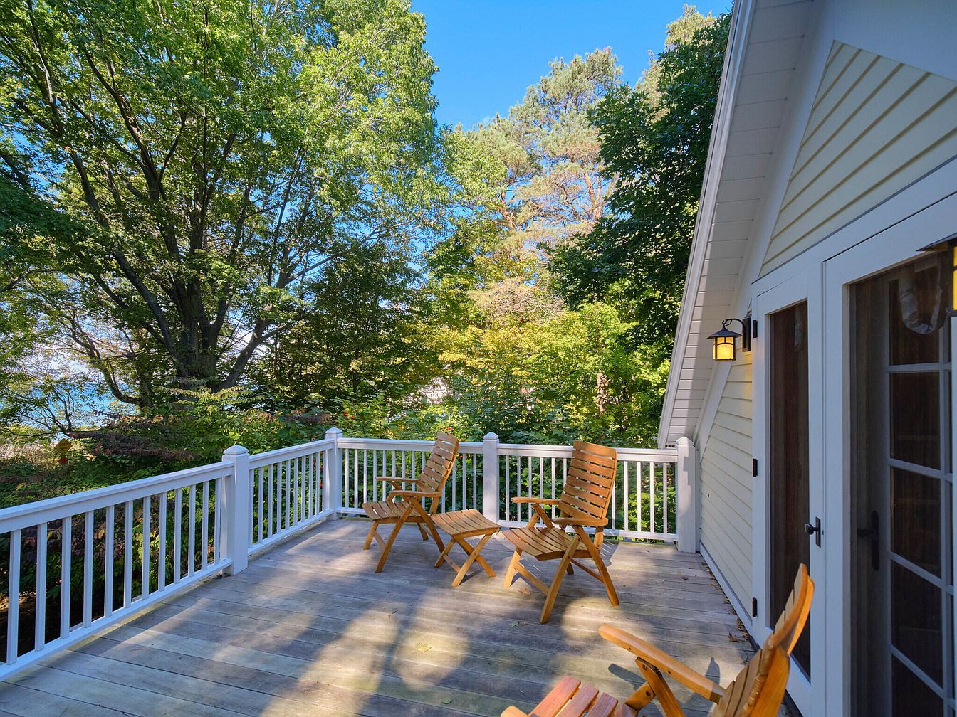 A spacious deck area features wooden planks and white railings, merging seamlessly with the surrounding nature. Sunlight filters through large trees, creating a blend of bright and shaded spots. Two simple, folding wooden chairs invite relaxation, emphasizing a casual outdoor vibe. A gently sloped rooflines complement the charming architectural style, with a lantern light fixture mounted beside glass double doors that lead inside. The overall color scheme is warm, blending earthy tones of the wood chairs with the soft yellow of the house, harmonizing with vibrant green foliage and the clear blue sky above.