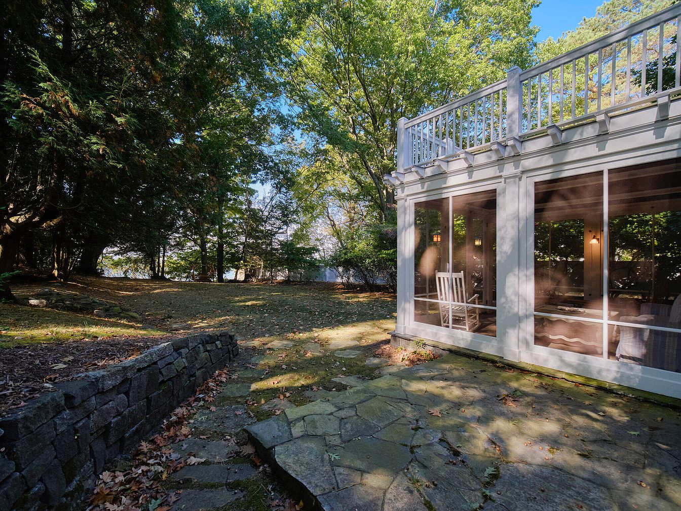 This screened porch forms a seamless connection to nature, featuring a light gray wooden frame that contrasts softly with the lush green surroundings. The large, expansive windows allow ample natural light to flood the space. Inside, a rustic rocking chair adds a charming focal point, inviting relaxation. The flooring is crafted from large, flat stones, providing a natural, organic feel. Beyond the porch, a gently sloping yard enhances the outdoor atmosphere, dotted with fallen leaves and bordered by a sturdy stone wall. The abundance of trees in the background completes this tranquil and inviting outdoor retreat.