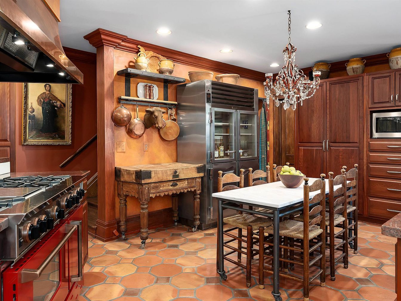 Warm terracotta tiles cover the floor of this inviting kitchen, complemented by rich, wood-paneled cabinetry and matching crown molding. A large red gas stove sits beside a rustic wooden prep table with ornate legs, while hanging copper pots and a decorative animal head add vintage charm. Industrial open shelving displays crockery above, with a stainless steel fridge and integrated microwave nearby. An elegant crystal chandelier hangs over a rectangular table with a white marble top, surrounded by ladder-back chairs with woven seats. Earthy walls, pottery above the cabinets, and a traditional portrait complete the historic, eclectic aesthetic.