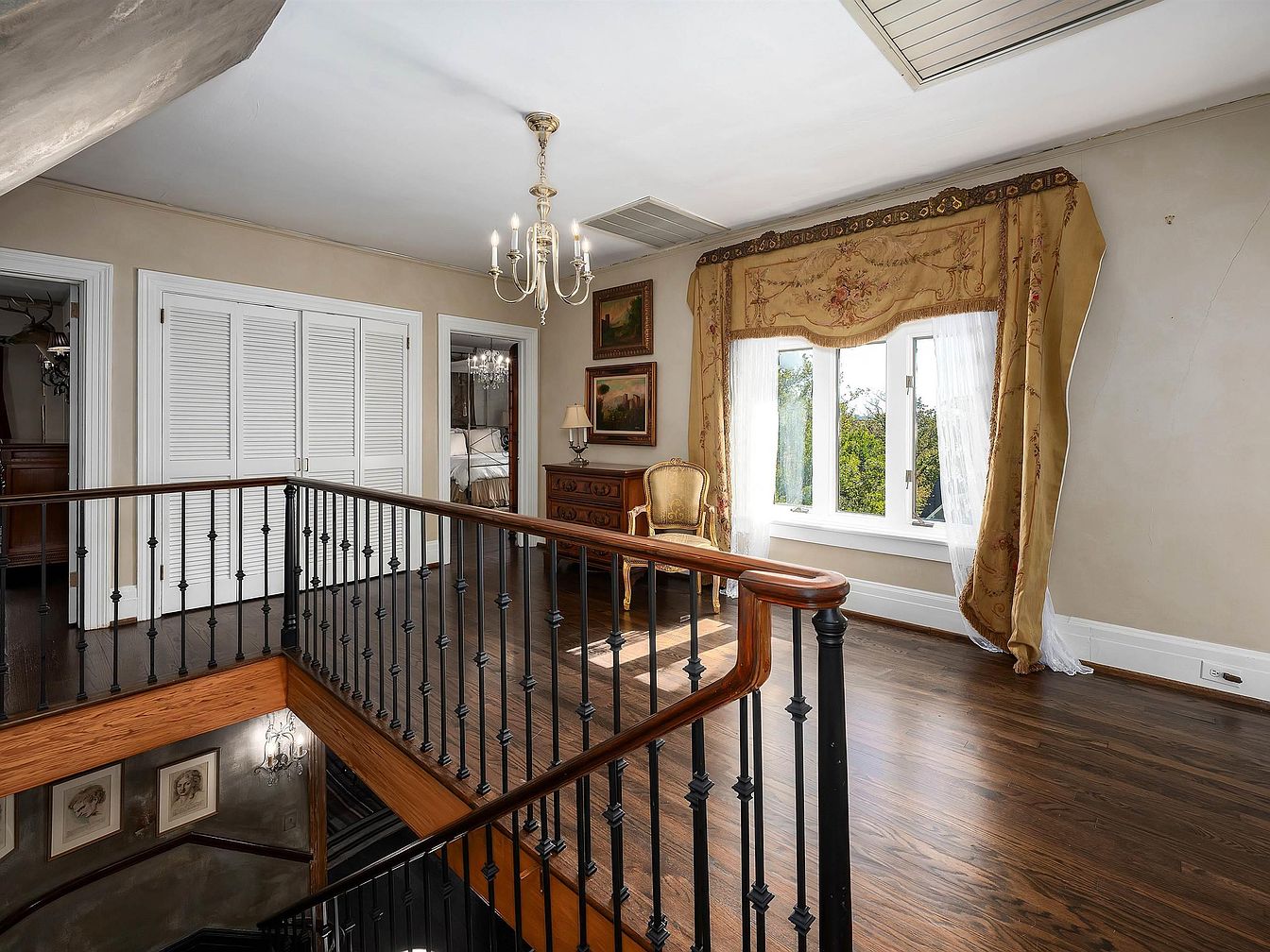 Spacious upstairs landing with dark hardwood floors and elegant wrought iron railing topped with a wooden banister, overlooking the staircase below. A large window, dressed in ornate gold valances and sheer white drapes, bathes the area in natural light. Below the window sits a vintage wooden desk with a delicate lamp and a carved chair upholstered in gold fabric, adding a touch of antique charm. The walls are painted a soft beige and feature classic white trim around wide doorframes and a set of double louvered doors. Decor includes traditional framed artwork and a gilt chandelier with candle-style lights.