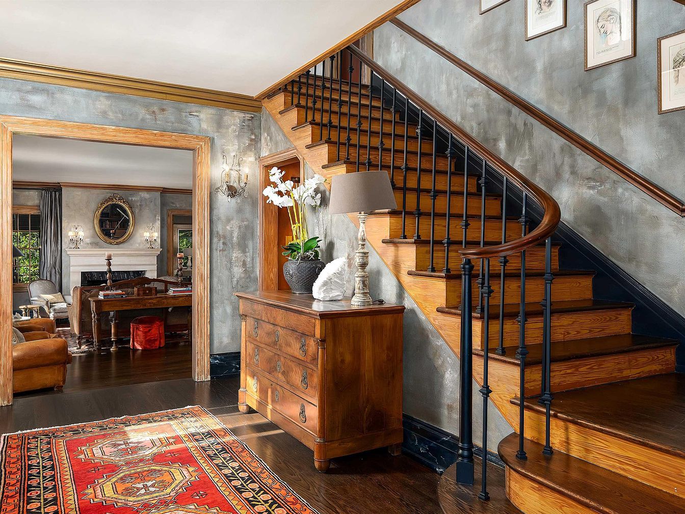 A grand wooden staircase with dark railings sweeps up from an entryway accented by a russet Persian-style rug on a rich, dark hardwood floor. A vintage wooden chest of drawers sits against a metallic silver-blue textured wall, topped with a modern lamp and a vase of white orchids. Framed sketches hang above the stairs. The room has detailed wood trim and molding, with a warm and inviting transition into a living space visible through a wide doorway. That adjoining room features a stately fireplace, leather seating, and classical decor, all contributing to an elegant historic ambiance.