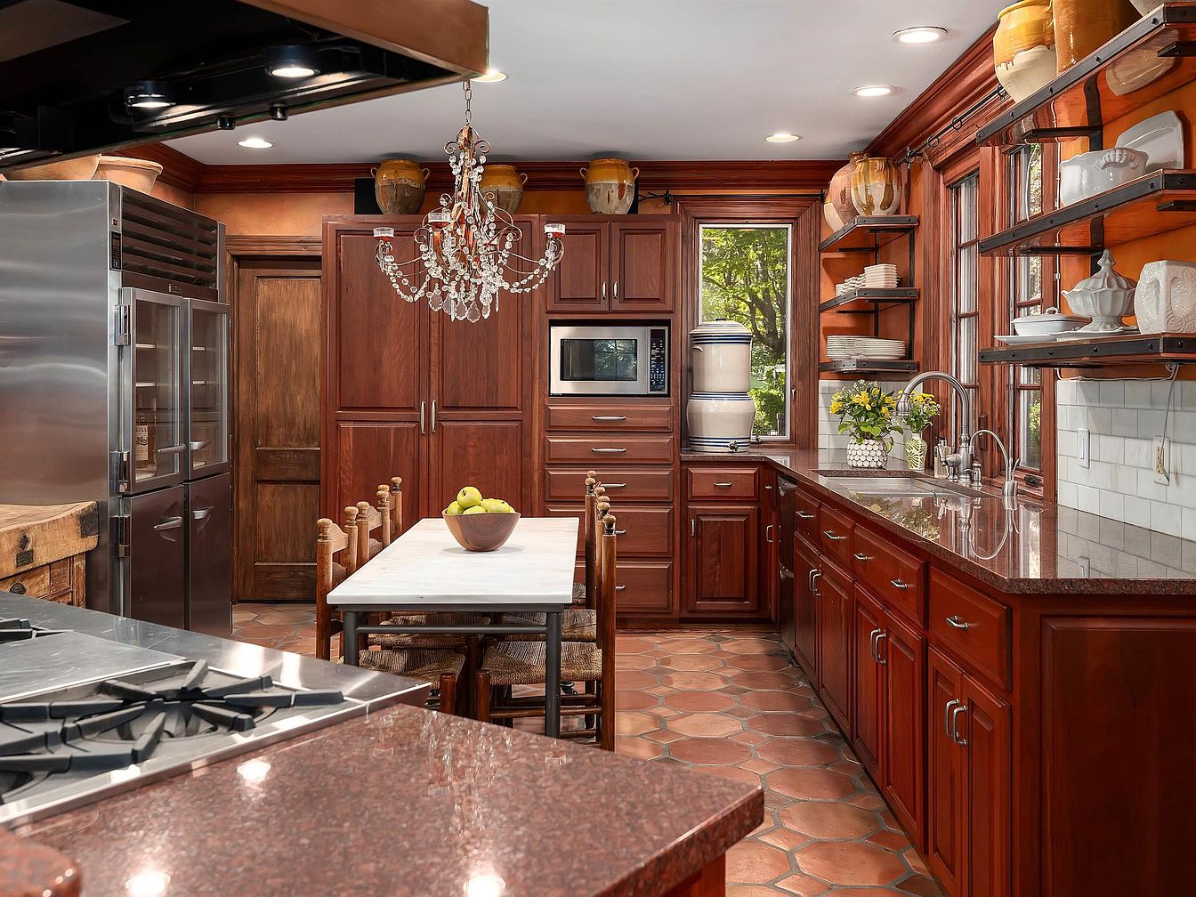 Warm, rich wood tones dominate the kitchen, from the cabinetry to the window framing and shelving. A long marble-topped table serves as both workspace and dining area, surrounded by eight wooden chairs with woven seats. Elegant touches include a sparkling crystal chandelier hanging above the table and open shelving displaying ceramics and dishware. Terra-cotta hexagonal tiles lend a rustic charm to the floor, complementing the warm reddish-brown palette. Stainless steel appliances, including a professional refrigerator and range, contrast with the classic cabinetry. Natural light streams through large windows over the sink, adding freshness with views of greenery outside.