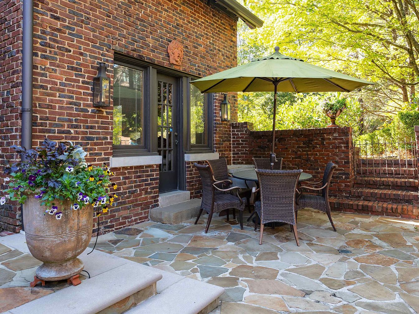 A cozy outdoor dining area set on a stone-tiled patio, adjoining a historic brick house with dark-framed windows and a glass-pane French door. Four woven rattan chairs surround a round table beneath a large, green patio umbrella that provides shade. The space radiates warmth through red brick, amber flagstone, and lush green surroundings. Decorative touches include a lion’s head medallion above the door and a classical urn overflowing with purple and yellow pansies. Stairs bordered by brick walls and wrought iron railings lead gracefully up, blending architecture and nature in a secluded garden retreat.