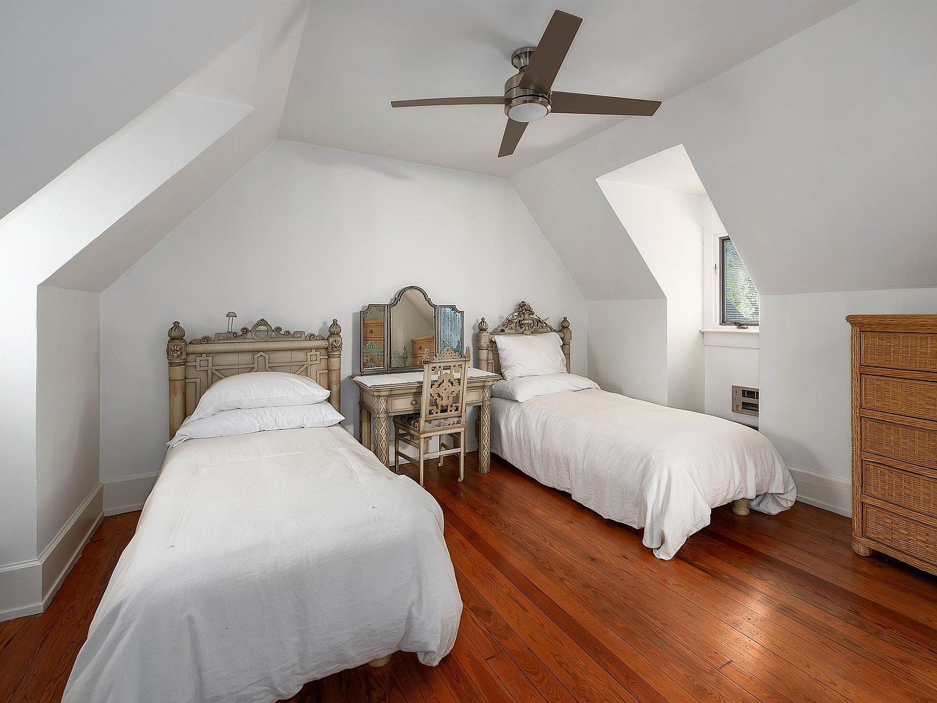 A cozy attic bedroom features two single beds with ornate, vintage-style headboards and crisp white linens. The walls and angled ceiling are painted white, enhancing the room’s light and airy feel. Warm honey-colored hardwood floors add contrast, while a ceiling fan with sleek modern blades provides functional comfort overhead. Between the beds sits a delicate vanity table and matching chair, both with decorative carvings and a tri-fold mirror. To the right, a woven rattan dresser offers additional storage. One window, set into a dormer, brings in natural light, highlighting the clean, tranquil ambiance of the space.