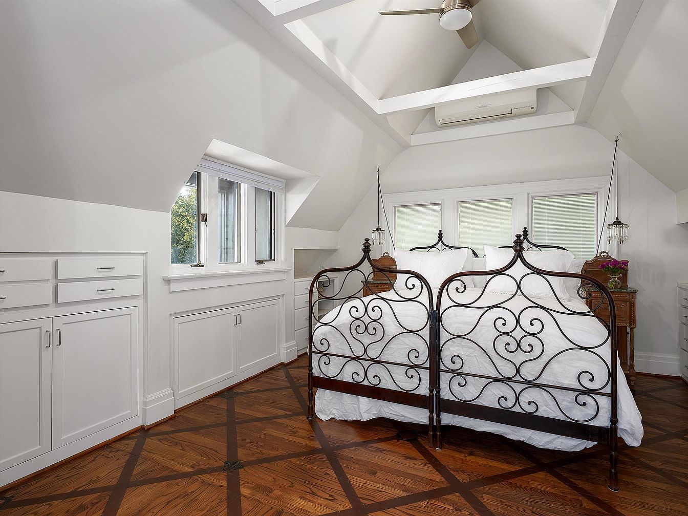 A bright, airy bedroom with vaulted ceilings and exposed beams painted white. The room features a pair of ornate, black wrought iron twin beds with crisp white bedding set against a wall of three small windows that let in natural light. Built-in white cabinetry lines the angled walls, offering ample storage and a streamlined look. A wooden nightstand with fresh flowers and hanging pendant lights adds a touch of warmth and charm. The hardwood floor is a rich medium brown with striking diagonal inlay patterns, providing contrast to the mostly white color palette and enhancing the room’s historic character.