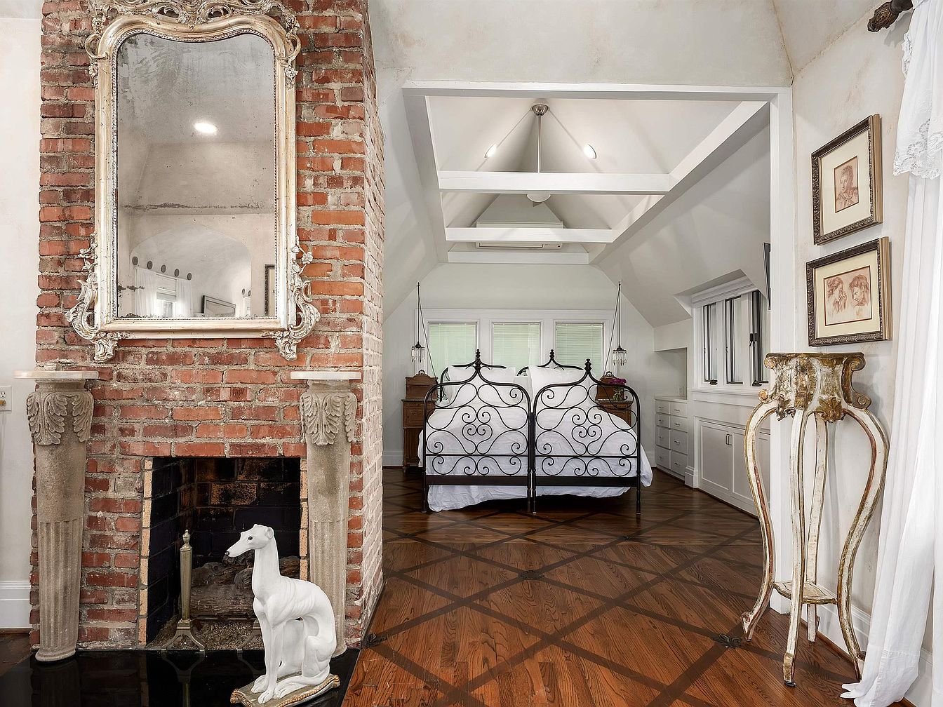 A bedroom space merges historical charm with elegance. A red brick fireplace featuring an ornate, weathered mirror above it stands out as a centerpiece, flanked by classical-style columns. On the hearth, a white ceramic greyhound figurine adds a playful touch. The room’s floors are richly patterned dark wood, giving warmth and coherence. The sleeping area is defined by a wrought iron bed with crisp white linens and inset windows along the back wall. Built-in cabinetry lines the angled walls, providing storage. Gilded accents and framed sketches add sophistication, while white drapery softens natural light entering the space.