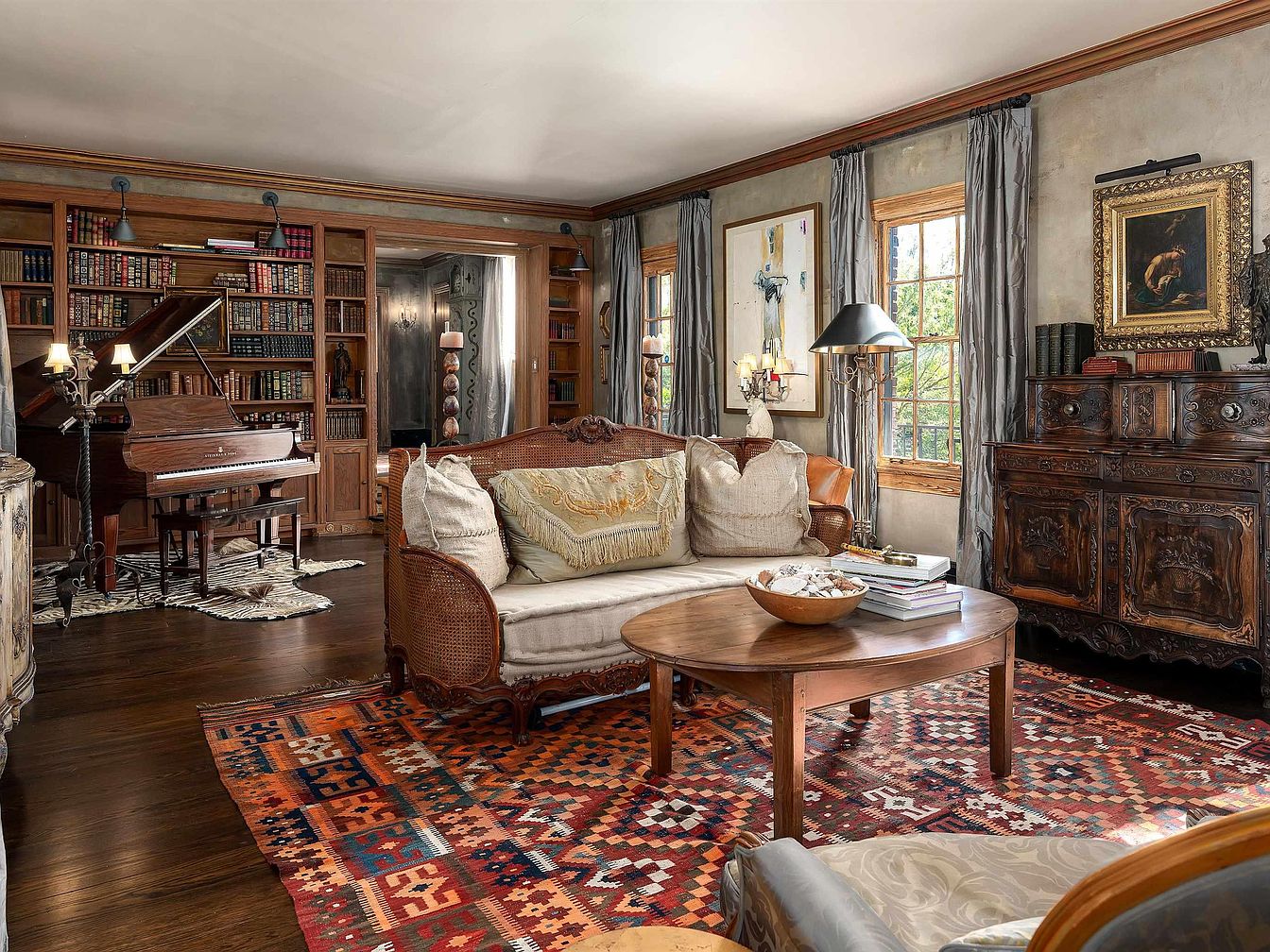 Rich wood tones define this spacious living room, featuring built-in shelves filled with antique books that line the far wall. A grand piano rests atop a small zebra print rug, adding elegance and a musical touch to the space. The seating area is anchored by a carved wooden sofa with plush neutral pillows and a round wooden coffee table, which sits on a large, vibrant geometric-patterned rug in warm reds, blues, and oranges. Two tall windows are framed by heavy gray drapes, letting in ample natural light. Ornate, dark-wood furniture and classical artwork lend a historic, sophisticated ambiance.