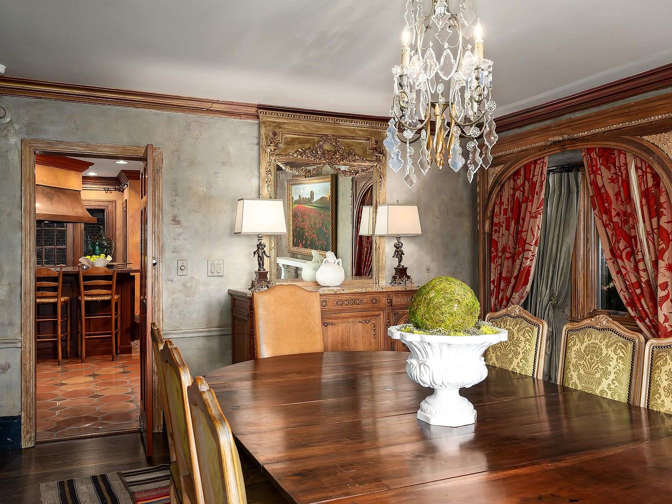A formal dining room with a large dark wood table surrounded by ornate high-back chairs upholstered in gold fabric patterned with damask designs. Rich, red-and-gold drapes frame arched windows, complemented by warm-toned, distressed wall finishes and elaborate crown molding. A crystal chandelier hangs overhead, casting sparkles onto the wood surface, which is centered with a decorative urn holding a mossy green orb. A classical sideboard sits against the far wall, adorned with table lamps, white ceramics, and a gilded mirror with intricate carvings. Through an open doorway, a warmly lit kitchen with terracotta tile flooring and wood cabinetry is visible.