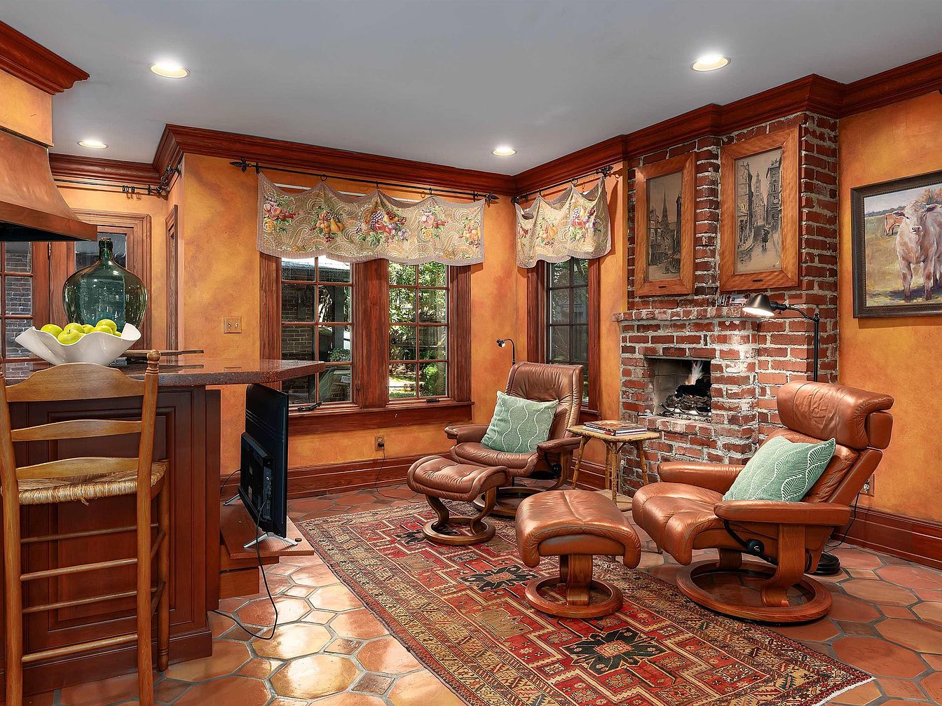 A cozy sitting area features two caramel-colored leather recliners with matching ottomans placed atop a patterned oriental rug. The room is anchored by a rustic red brick fireplace, flanked by framed art in wooden frames. Warm, golden-orange textured walls complement the terra-cotta hexagonal tile flooring. Three large wood-trimmed windows allow natural light to filter in, topped with floral embroidered valances. In the adjacent corner, a dark wood breakfast bar with a bowl of green apples and a large glass jug sits beside a woven-seat chair, blending seamlessly with the traditional, inviting country-style decor.