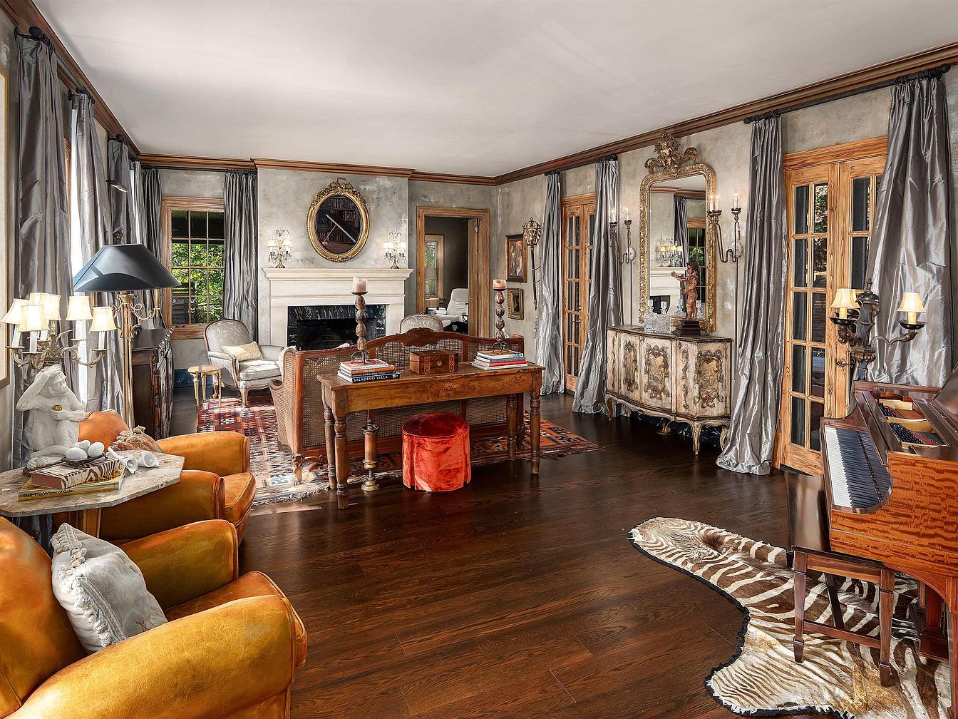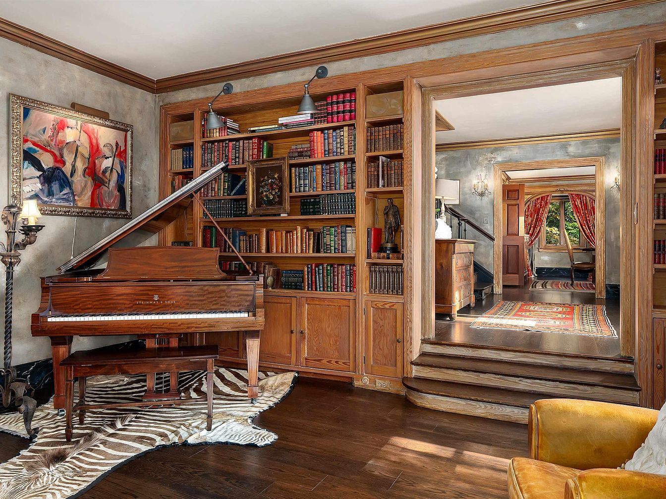 A grand piano with a polished wood finish is the focal point, resting atop a zebra-print rug in front of an extensive built-in bookshelf filled with colorfully bound volumes. The shelves, cabinetry, and door frames are made from warm-hued wood, giving the room a classic, inviting feel. An abstract painting in vivid reds and blues hangs above the piano, adding modern artistry. Sconces and a candelabrum lend ambient lighting. Wide wooden doorways reveal adjacent rooms, defined by ornate trim and Persian-style runners on dark wood floors. Rich textures, layered patterns, and vibrant curtains further emphasize a sense of historical charm and elegance.