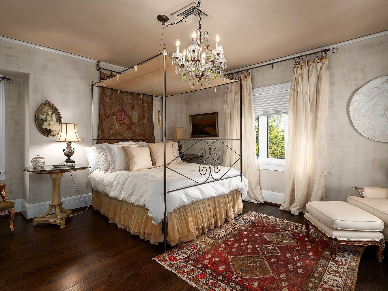 Spacious bedroom with a vintage, romantic aesthetic. Dominated by a four-poster canopy bed adorned with white linens, gold accent pillows, and a pale ruffled bed skirt. A sparkling crystal chandelier hangs overhead, contributing to the elegant atmosphere. The room features cream-colored walls with a subtle stucco texture and soft golden-beige drapes framing a window that allows in natural light. Dark hardwood floors are partially covered by a richly patterned red oriental rug. Beside the bed is a glass-topped side table with a sculpted base and a classic lamp. An upholstered chaise lounge with a matching ottoman sits in the corner, inviting relaxation.