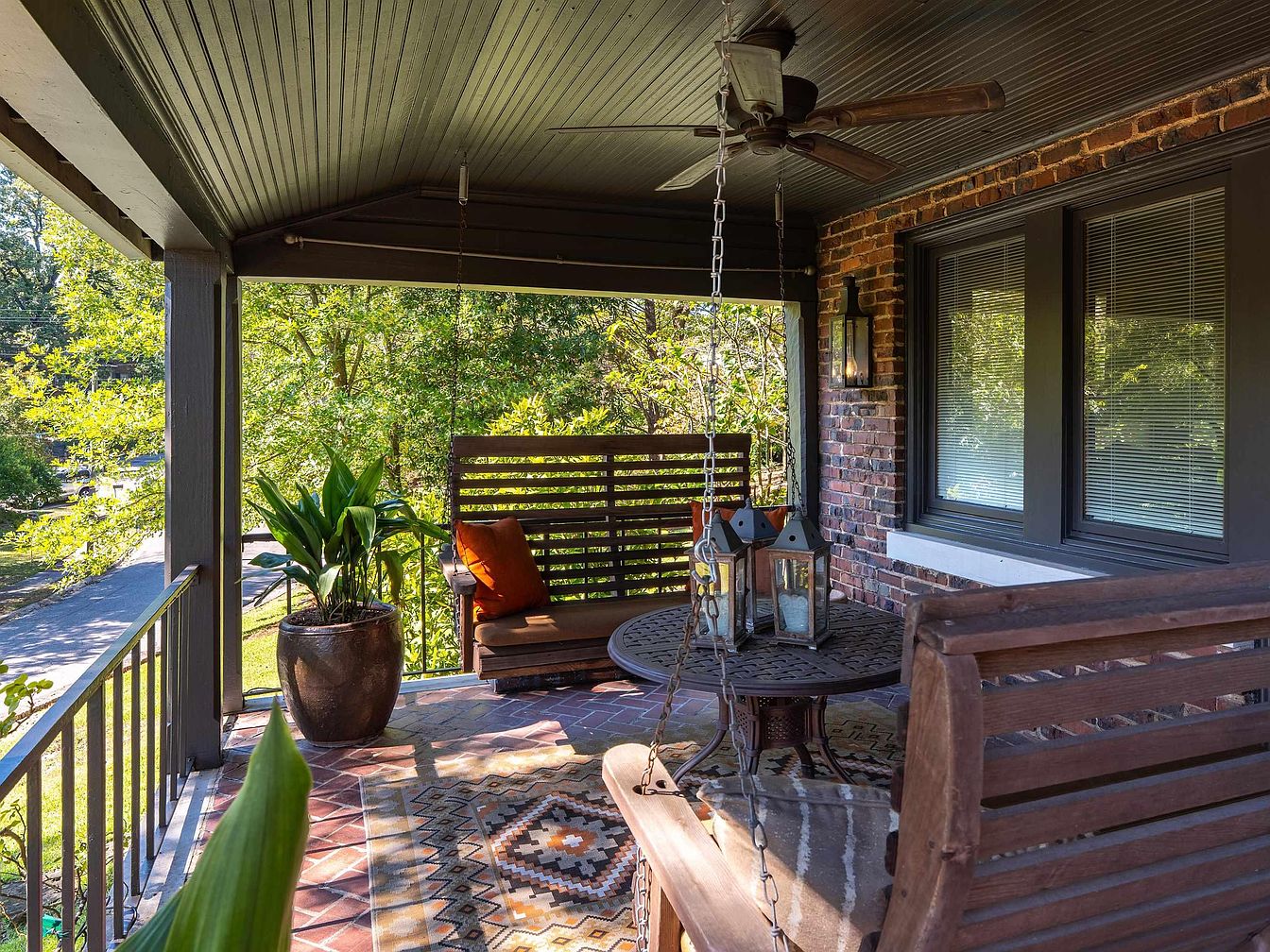 A covered front porch with a cozy, rustic design features a suspended wooden porch swing with a burnt orange pillow and another matching wooden bench. A large, leafy potted plant sits on the left-near edge, while an intricate, geometric-patterned rug covers the brick-tile floor, adding warmth and color. A round metal table at the center holds lanterns for a touch of vintage style. The porch ceiling and trim are painted a muted greenish-gray, complementing the exposed red brick walls. Soft sunlight filters through leafy trees, creating a tranquil, shaded retreat with a view of the residential street beyond.