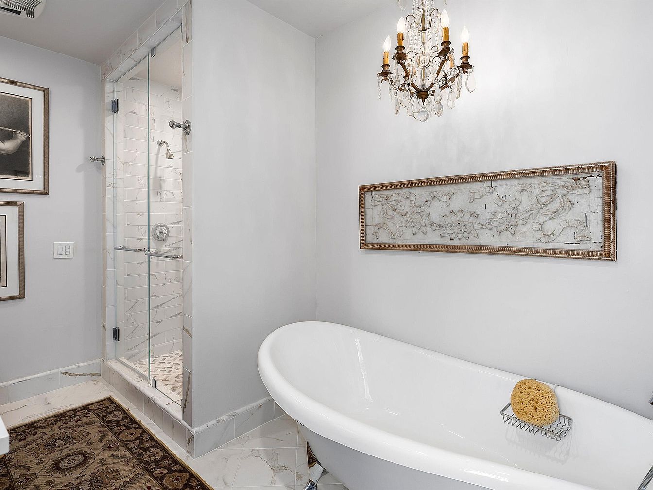 An elegant bathroom featuring a freestanding white bathtub set on polished marble flooring with gray veining. A glass-enclosed shower with marble tile walls and a chrome showerhead is tucked neatly into the corner. A vintage-style chandelier with crystal accents hangs above, adding a touch of old-world luxury. The walls are painted a soft, pale gray, creating a calming atmosphere. An ornate, horizontal wall art piece with delicate sculpted designs hangs above the bathtub. A plush oriental-style rug with intricate patterns and deep colors provides warmth at the foot of the tub, while black-and-white framed prints hang nearby, adding sophistication.