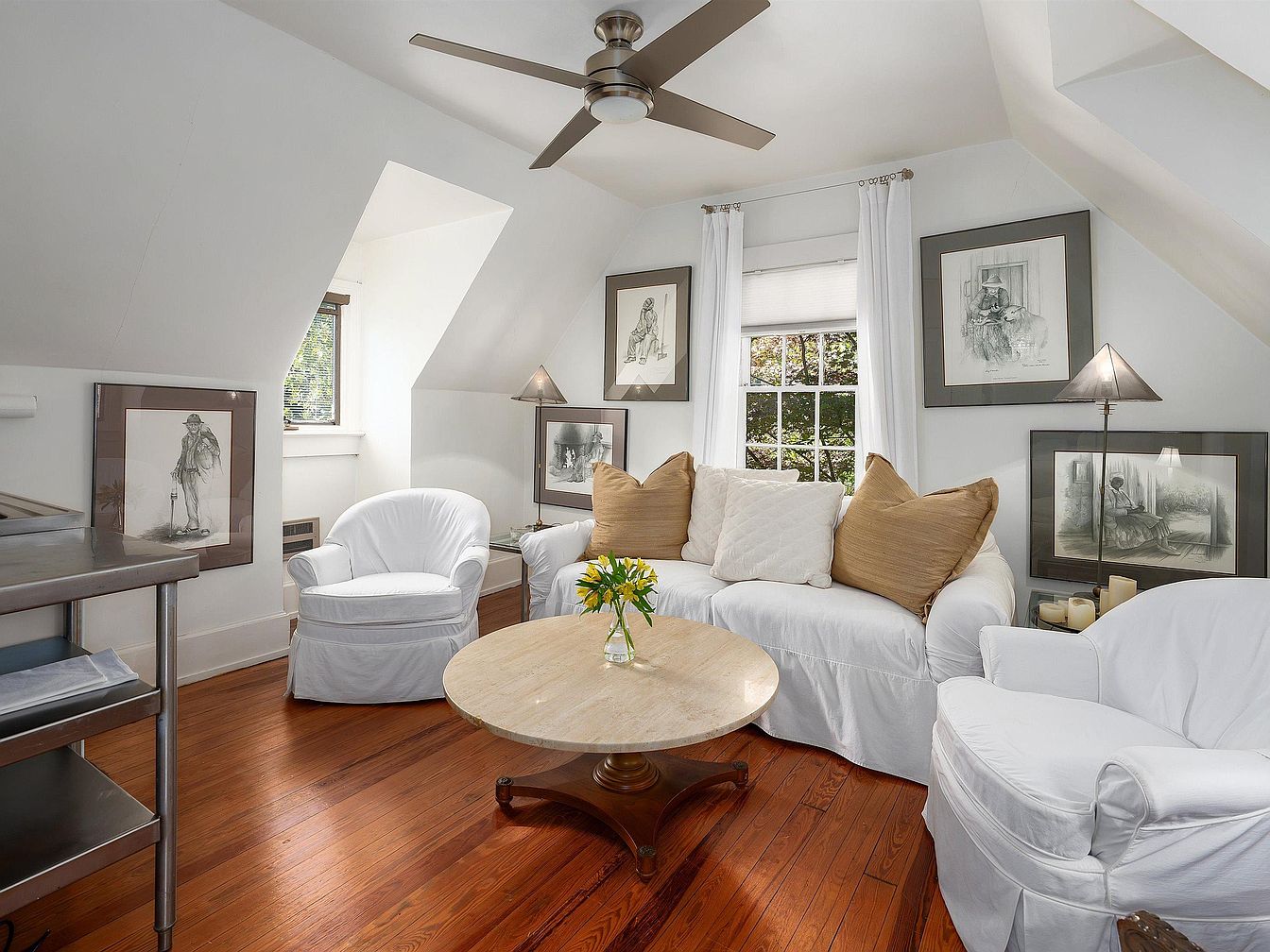 A cozy sitting area with sloped ceilings and crisp white walls. The space features a white slipcovered sofa with oversized beige and white cushions, flanked by two matching white armchairs. A round marble-topped coffee table sits centrally, holding a small vase of yellow flowers. The warm-toned hardwood floor adds contrast and warmth, while natural light streams in from a window with white curtains. On the walls and beside the seating, black-framed sketches lean and hang, lending an artistic, gallery-like atmosphere. Two geometric floor lamps and arranged candles enhance the relaxed, curated aesthetic of the room.