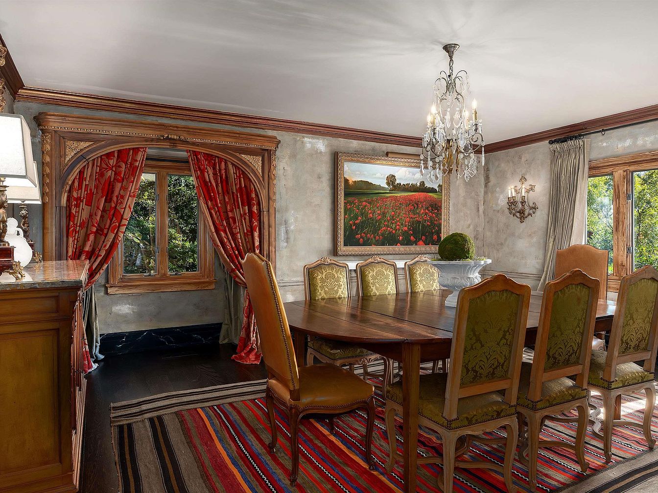 A formal dining room featuring a long wooden table surrounded by eight ornate chairs with golden-green brocade upholstery and carved wood frames. Walls are finished with a distressed, antiqued effect, and the room is illuminated by an elaborate crystal chandelier and wall sconces with shades. Rich red and gold drapes frame a large window with intricately carved wooden moulding. Another window is framed with neutral curtains, and both allow natural light to spill in, highlighting a vibrant, multicolored striped area rug beneath the table. A framed landscape painting of a tulip field adds color, while classical wood furniture enhances the historic elegance.
