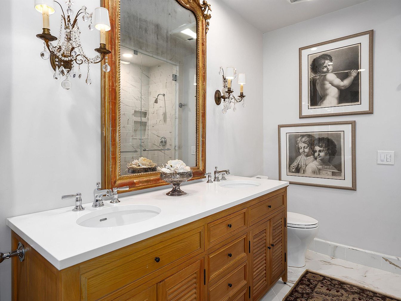 Long double-sink vanity made of honey-toned wood stands against a white wall, topped with a smooth white countertop. Above the counter hangs a large, ornately framed gold mirror that reflects a walk-in shower with white subway tiles and glass doors. Elegant sconces flank the mirror, each adorned with crystals and traditional candle-style bulbs, contributing a touch of old-world charm. On the adjacent wall, two framed, classical-style black and white art prints add a sophisticated atmosphere. The space is finished with marble flooring, crisp white walls, and a regal brown-patterned rug underfoot, blending traditional and contemporary elements seamlessly.