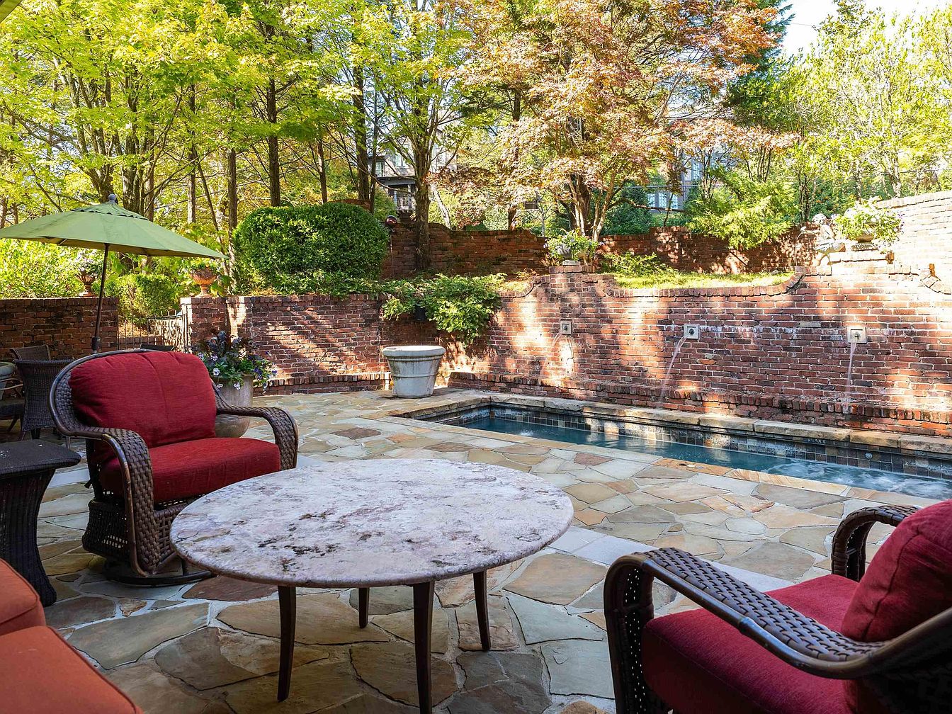 An inviting outdoor patio features a natural stone tile floor and is bordered by classic red brick walls. The seating area consists of wicker armchairs and a sofa, all with deep red cushions, arranged around a round marble-topped table. A green patio umbrella stands over a dining set in the background, providing shade. Lush greenery and well-manicured shrubs are planted along the edges, with trees providing dappled sunlight. Water spouts built into the brick wall cascade into a narrow rectangular pool, adding a tranquil ambience. The scene feels secluded, blending historic architecture with vibrant landscaping.