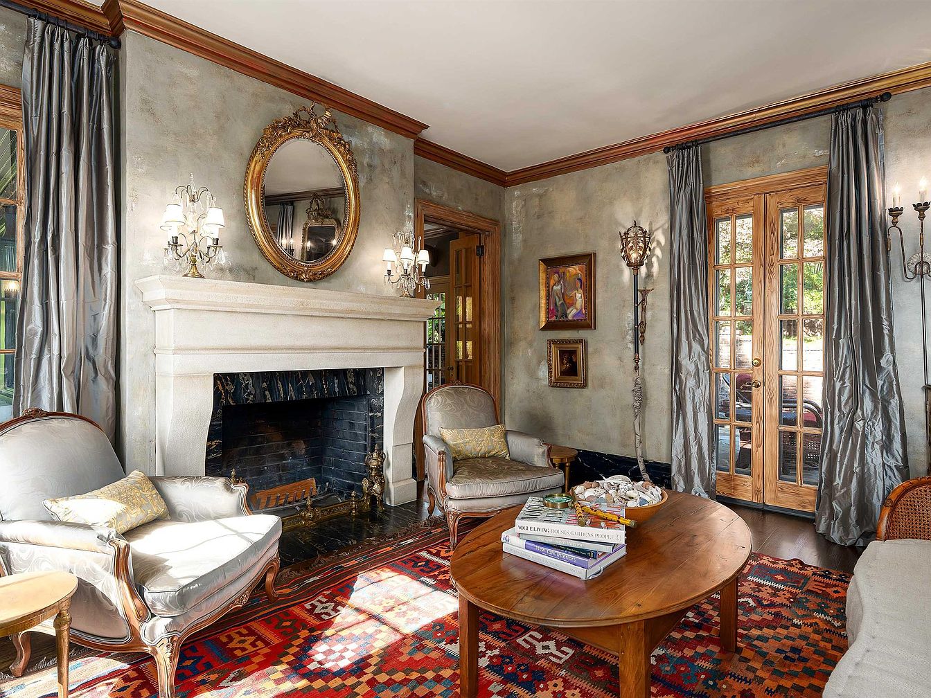 A warm and inviting living room anchored by a grand white fireplace with a dark marble hearth, flanked by ornate sconces and topped by a large gold-framed oval mirror. Tall French doors with natural wood frames allow sunlight to pour in, complemented by long, silvery drapes that give the room an elegant, historic feel. Two armchairs with intricate woodwork and light upholstery sit on either side, their soft curves matched by a round wooden coffee table in the center. Books and a decorative tray rest atop the table, all layered over a vibrant patterned rug in rich reds, blues, and creams.