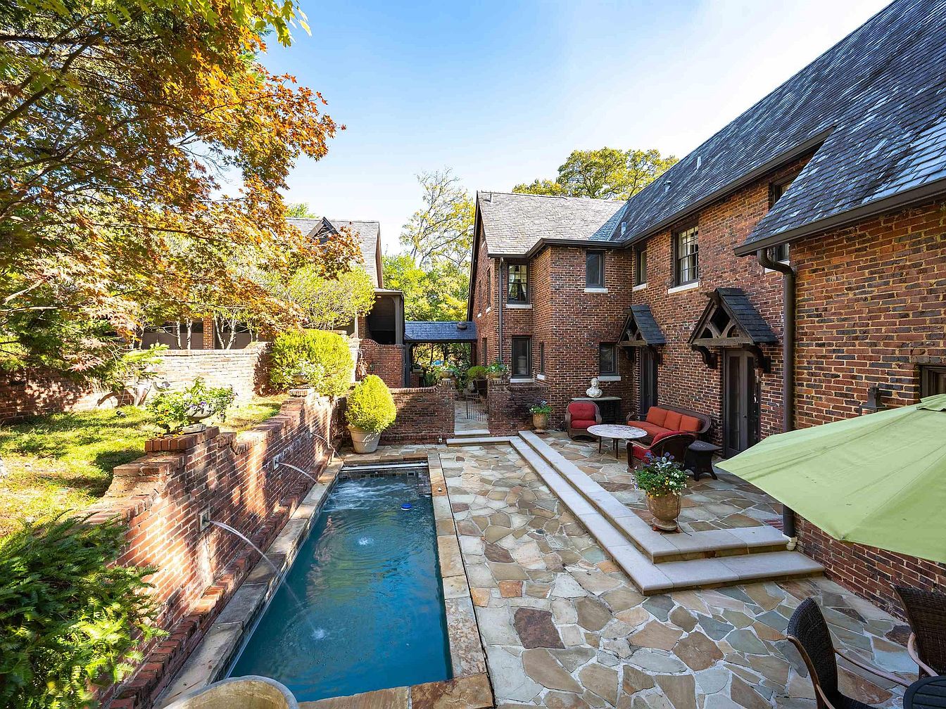 A secluded backyard patio bordered by brick walls and the historic brick exterior of the house features a narrow swimming pool running alongside a tiered stone terrace. The area is adorned with potted plants, comfortable rust-colored cushioned seating, and a round table for alfresco gatherings. Large flagstones create a natural-looking flooring, while shady trees and trimmed hedges enhance the lush atmosphere. A green patio umbrella provides a splash of color and shade over a dining set in the corner. Architectural details include steep slate roofs, multi-paned windows, and arched wooden awnings above doors, emphasizing a classic American heritage aesthetic.