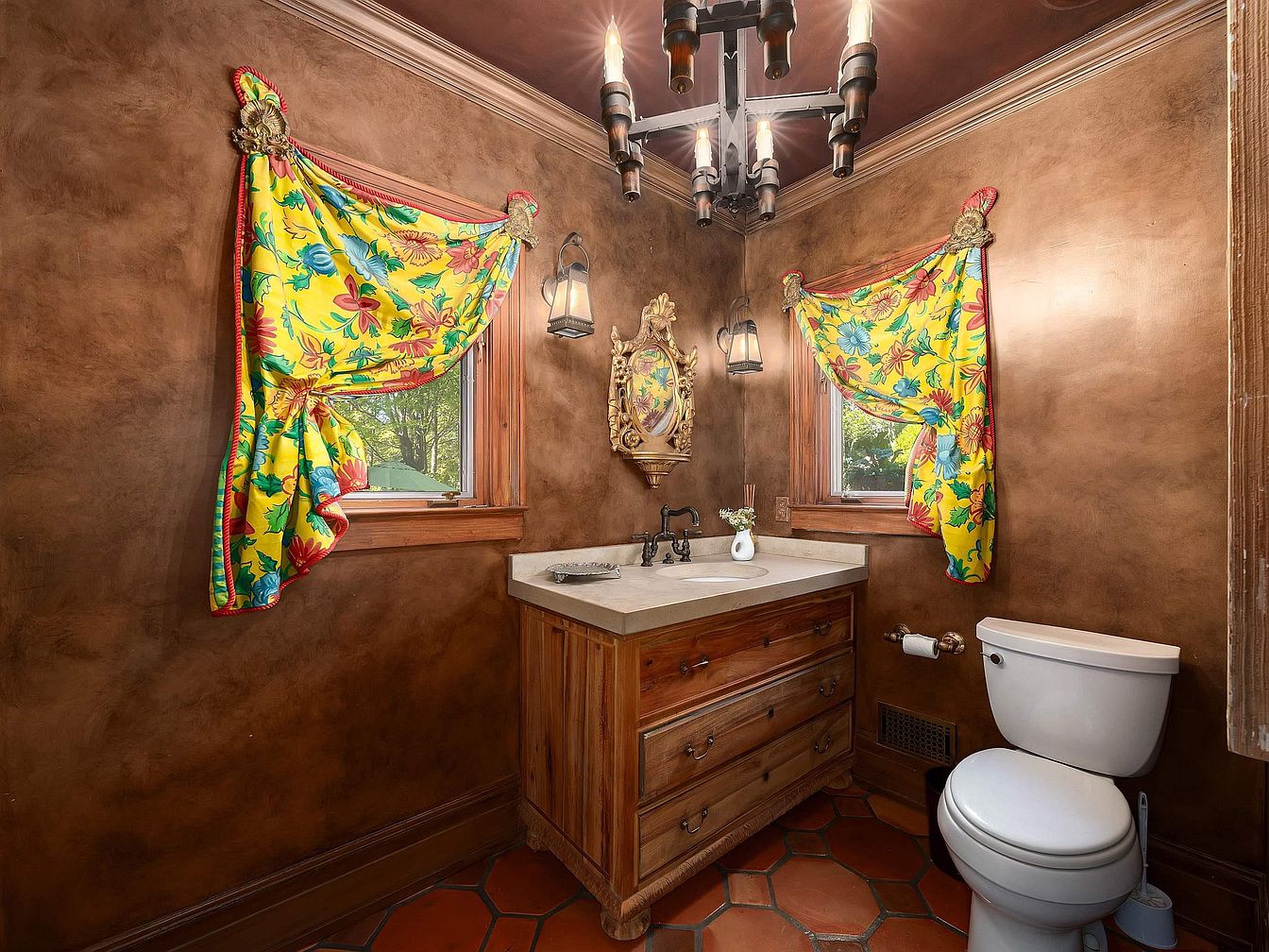 Warm earth-toned walls and terracotta tile flooring create a cozy Old World feel in this bathroom. Two windows, trimmed in natural wood, are dressed with vibrant yellow curtains covered in red and teal floral patterns, cinched at the sides with tasseled tiebacks. A rustic wooden vanity with a concrete countertop houses a porcelain sink and vintage-style faucet. Above the sink, an ornate gold-framed mirror is surrounded by two lantern-inspired sconces. A modern white toilet is positioned to the right, and a bold black metal chandelier hangs from the ceiling, enhancing the eclectic mix of traditional and colorful design elements.