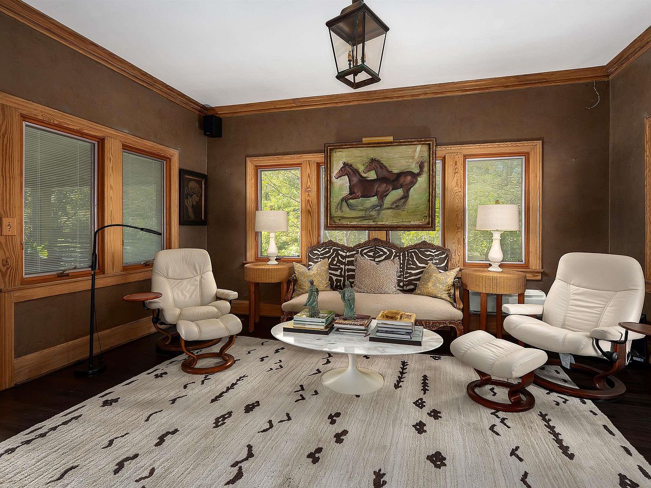 A cozy living room is arranged with a mid-century blend of earth tones and natural textures. Deep brown walls are trimmed in light, honey-hued woodwork, echoing the frames of three large windows that let in gentle natural light. A soft, patterned rug in cream and brown covers the dark wood floor. The seating comprises a vintage-style sofa adorned with animal print and textured pillows, flanked by two matching cream leather recliners with wooden bases. A round white marble coffee table holds books and small decor, while side tables with white lamps bookend the sofa. Above, a bold horse painting dominates the visual focal point.