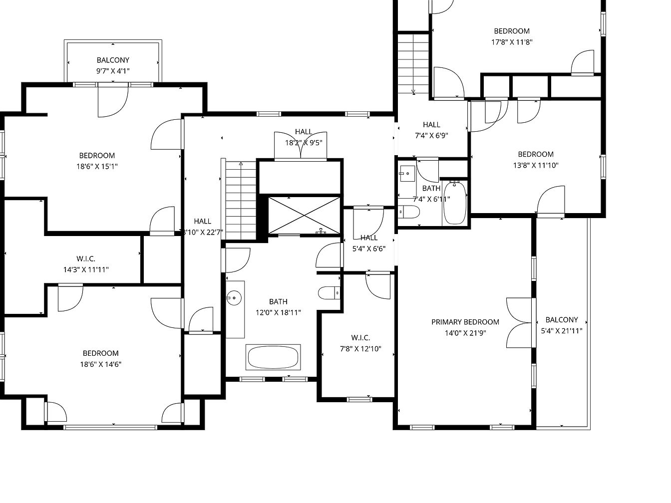 This floor plan shows the upper level of a large historic home. There are five spacious bedrooms, each with generous proportions, two of which have direct access to private balconies for outdoor views. The primary bedroom includes a substantial walk-in closet and direct balcony entrance. Hallways connect the bedrooms and provide access to two bathrooms—one large bath with a tub and another smaller bath. Each room features clear door placements and logical flow. The overall layout emphasizes function and space, with dedicated walk-in closets, clearly defined living zones, and ample circulation areas suited for comfortable family living.