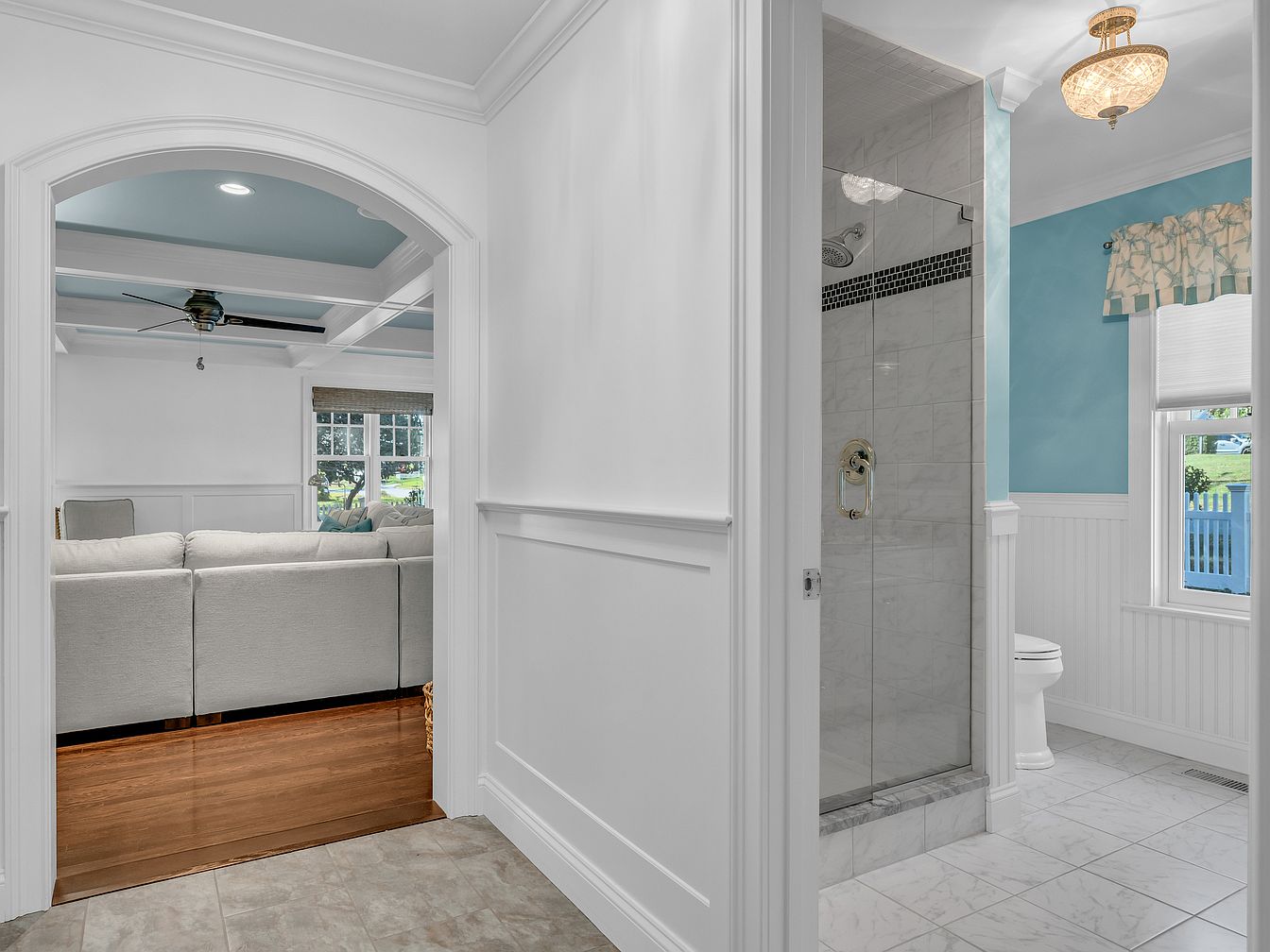 A wide hallway features classic white wainscoting and crown molding, opening to a living room on the left and a bathroom straight ahead. The living room showcases a soft beige sectional sofa with a coffered ceiling painted light blue and fitted with a modern black ceiling fan. The bathroom has glossy marble tile flooring, a walk-in glass shower with white and gray tiling, soft blue painted upper walls, and a crystal ceiling fixture. Sunlight streams through large double-hung windows with patterned valances, creating a bright and welcoming atmosphere that blends historic charm with a fresh palette.