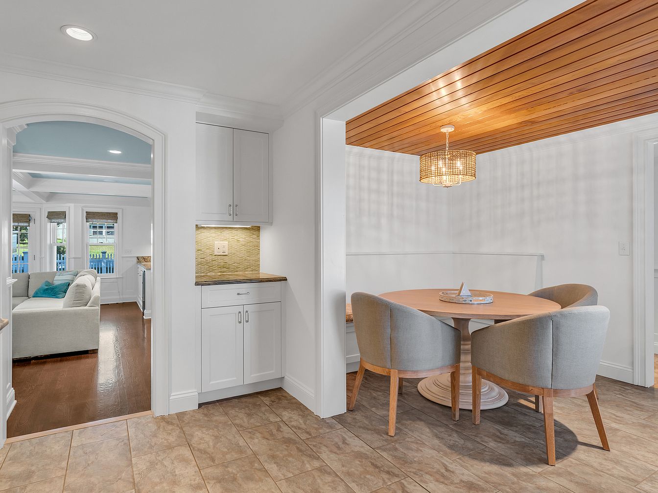 A cozy and modern breakfast nook features a round light wood table surrounded by four upholstered chairs in soft gray fabric, set against white walls. The ceiling above the nook is lined with warm-toned wood planks, complemented by a woven rattan-style light fixture that casts subtle, patterned shadows. The space opens onto a hallway with beige tile flooring, and adjacent white cabinetry with a small stone countertop and mosaic backsplash. In the background, there’s a glimpse of the living room with a light-colored sectional and hardwood floors, creating a bright and inviting atmosphere throughout the open-plan home.