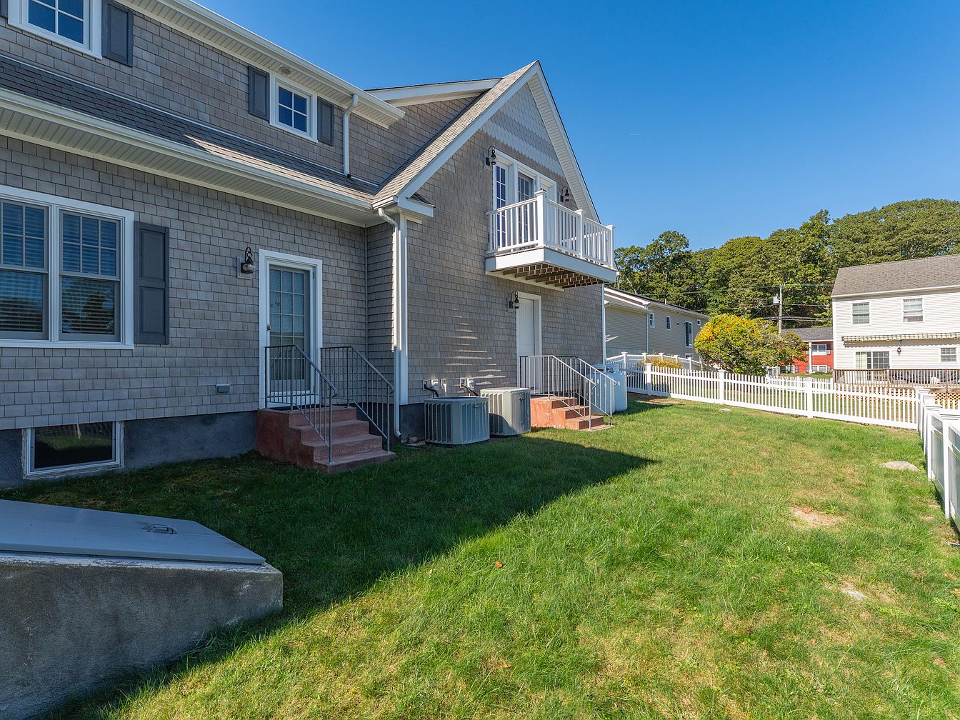 A grassy backyard bordered by a white picket fence provides a private, enclosed outdoor space. The exterior of the house is finished with gray wooden shingles and white trim, offering a classic New England look. There are two short stairways with metal railings leading up to separate entry doors with glass panels. A small balcony with white railings extends from the upper level, overlooking the yard. Windows with white shutters and a pair of outdoor HVAC units rest along the foundation. The overall design is clean and understated, with an emphasis on functionality and traditional charm.