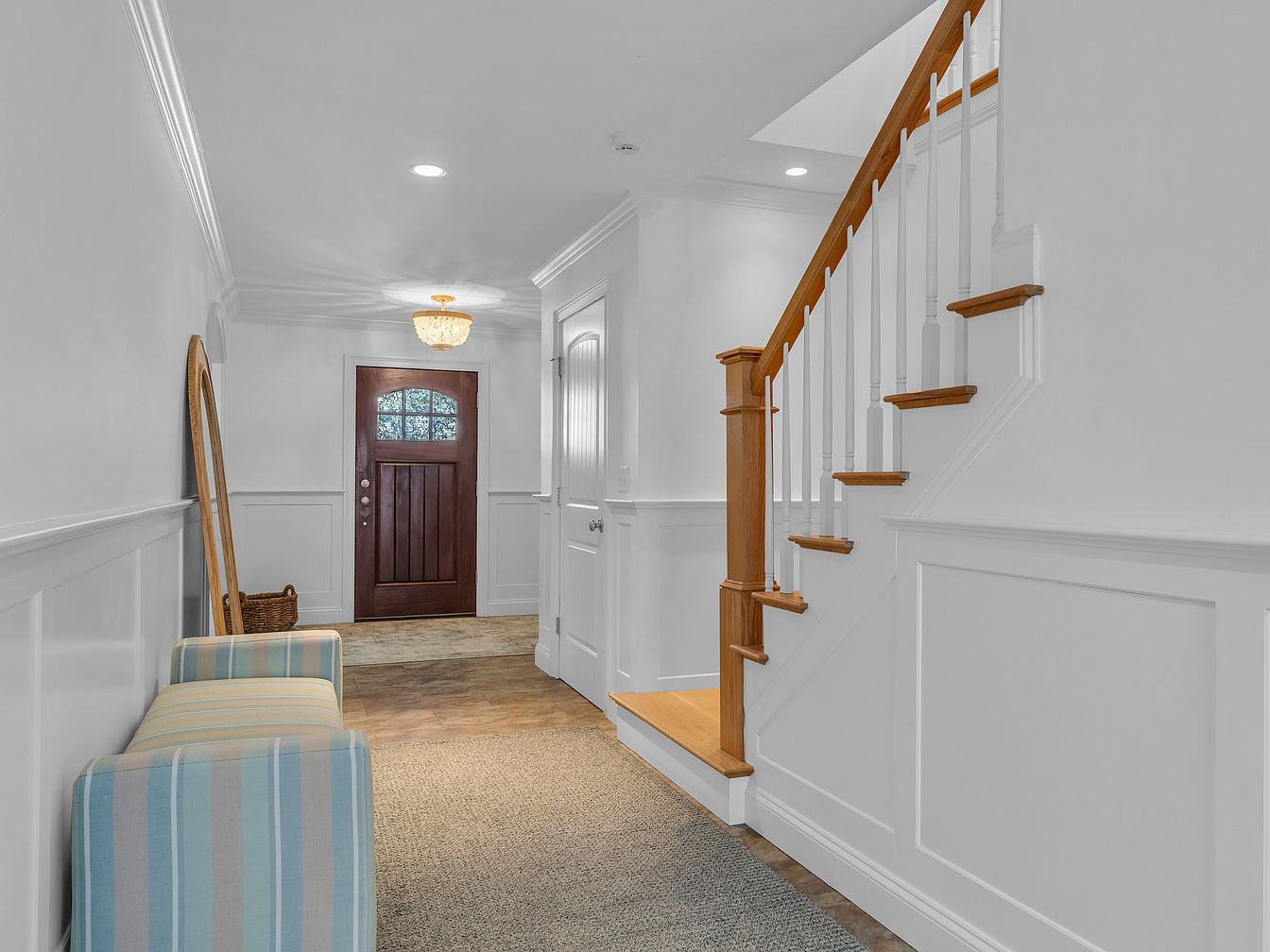 A bright and welcoming hallway with crisp white wainscoting and walls, complemented by crown molding and a soft beige carpet runner. To the left stands a pale blue and white striped armchair, beside which leans a large, arched mirror that amplifies the sense of space. The wooden staircase features oak treads and white balusters, adding a classic yet inviting touch. At the end, a rich wood front door with a semicircular glass pane brings in natural light. Overhead, a small, elegant chandelier softly illuminates the area, while a woven basket sits in the corner for practical storage.