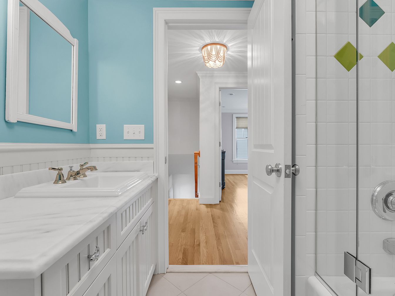 A bright and airy bathroom leads directly into a hallway with hardwood floors. The bathroom walls are painted a refreshing sky blue above classic white beadboard wainscoting. There is a wide white marble countertop with dual sinks and vintage-style chrome fixtures, complemented by a matching framed mirror above. The shower area features white square tiles with green diamond accents for a subtle pop of color. Natural light pours in from the adjacent space, and the door stands open to reveal a hallway lit by a beaded chandelier, blending modern and traditional elements throughout.