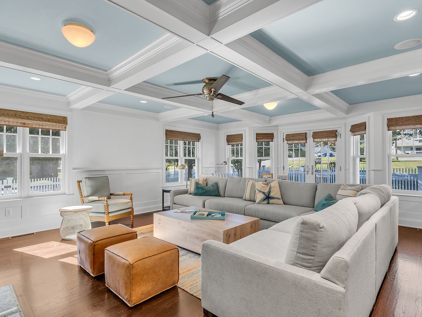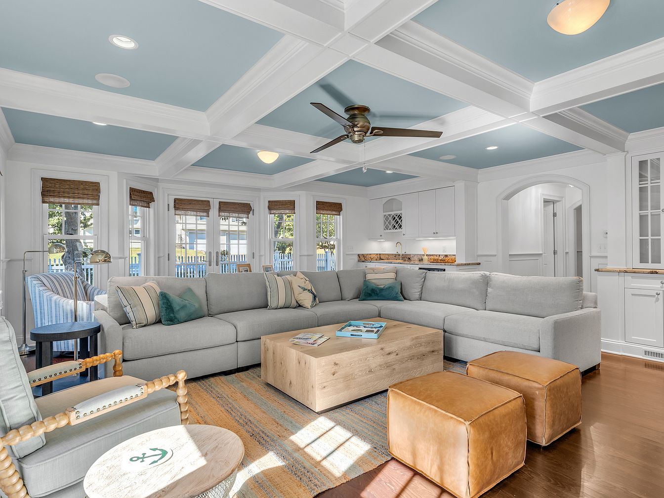 A spacious living room with a large, L-shaped light gray sectional sofa takes center stage, adorned with striped and solid throw pillows in muted blues and greens. The aesthetic is airy and coastal, with a sky-blue coffered ceiling framed in crisp white beams and trim. Natural light floods the room through five tall windows covered with woven wood shades. A contemporary ceiling fan hangs overhead, while touches of warm wood—including the coffee table, side table, and tan leather ottomans—add depth. Gleaming hardwood floors anchor the space, and the open design leads seamlessly to a white, classic-style kitchen.