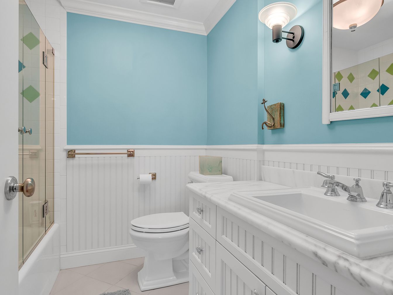 A compact, fresh bathroom featuring powder-blue upper walls and bright white beadboard wainscoting for a vintage touch. The white marble countertop sits atop a classic double-sink vanity with paneled cabinet fronts and chrome hardware. The toilet sits neatly beside the counter, beneath a chrome towel rack and adjacent to a small glass-and-tile shower. The shower is enclosed with glass and decorated inside with an accent tile band of green and blue diamonds. Modern chrome fixtures, a wall-mounted sconce, and a wall-mounted brass hook combine traditional details with a crisp, airy palette for a cheerful, clean ambiance.