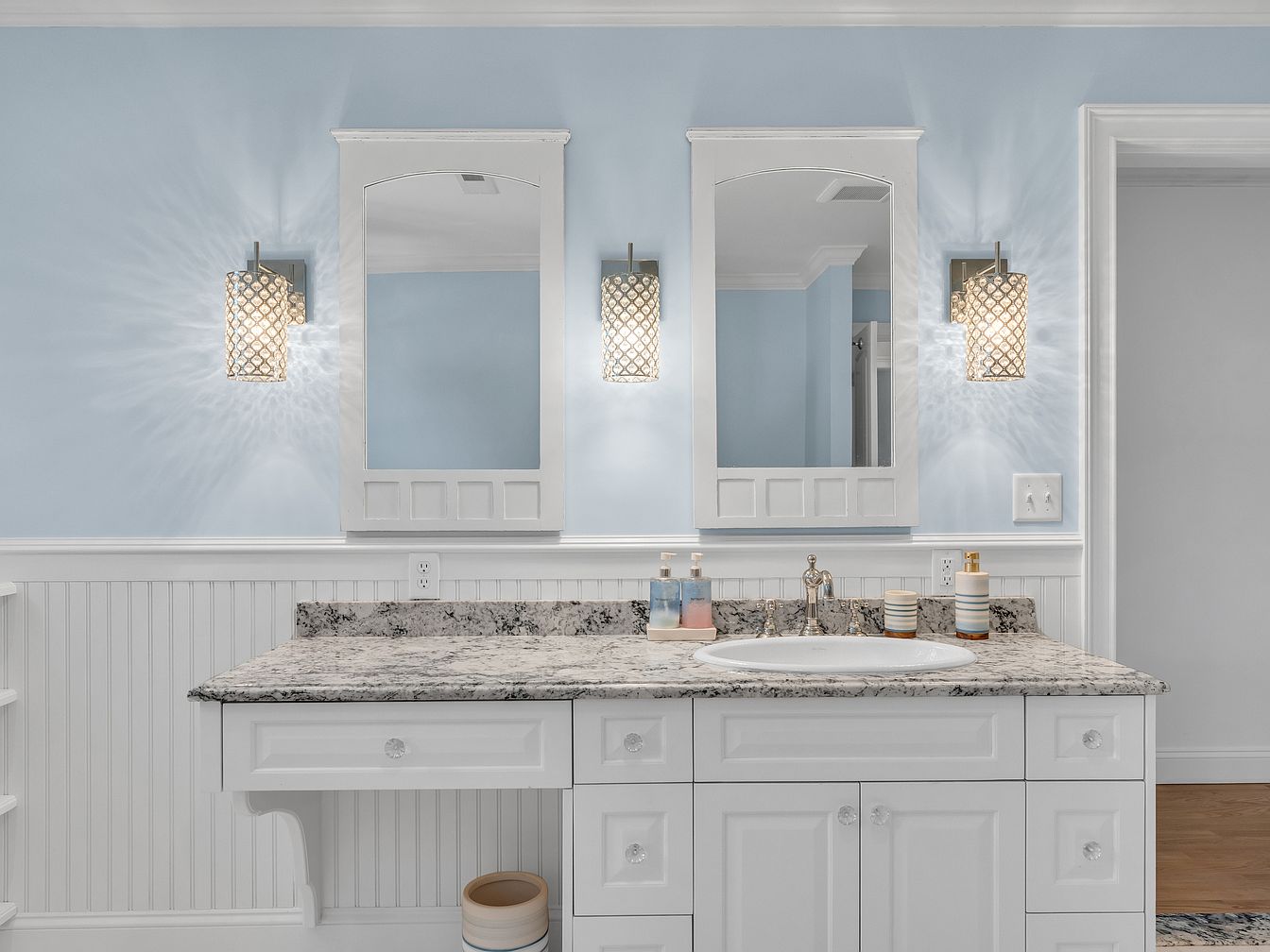 A bright and airy bathroom features a double-sink vanity with a polished granite countertop, set against a light blue wall. Two white-framed mirrors hang above each sink, flanked by contemporary wall sconces that cast a geometric pattern of light across the wall. The vanity is classic in style, with raised panel drawers and crystal cabinet knobs. Below, beadboard paneling adds texture and a touch of traditional charm. The fixtures are silver, and the counter is accessorized with striped containers and liquid soap bottles, blending subtle elegance with functional design. Clean lines and soft tones create a fresh, inviting atmosphere.