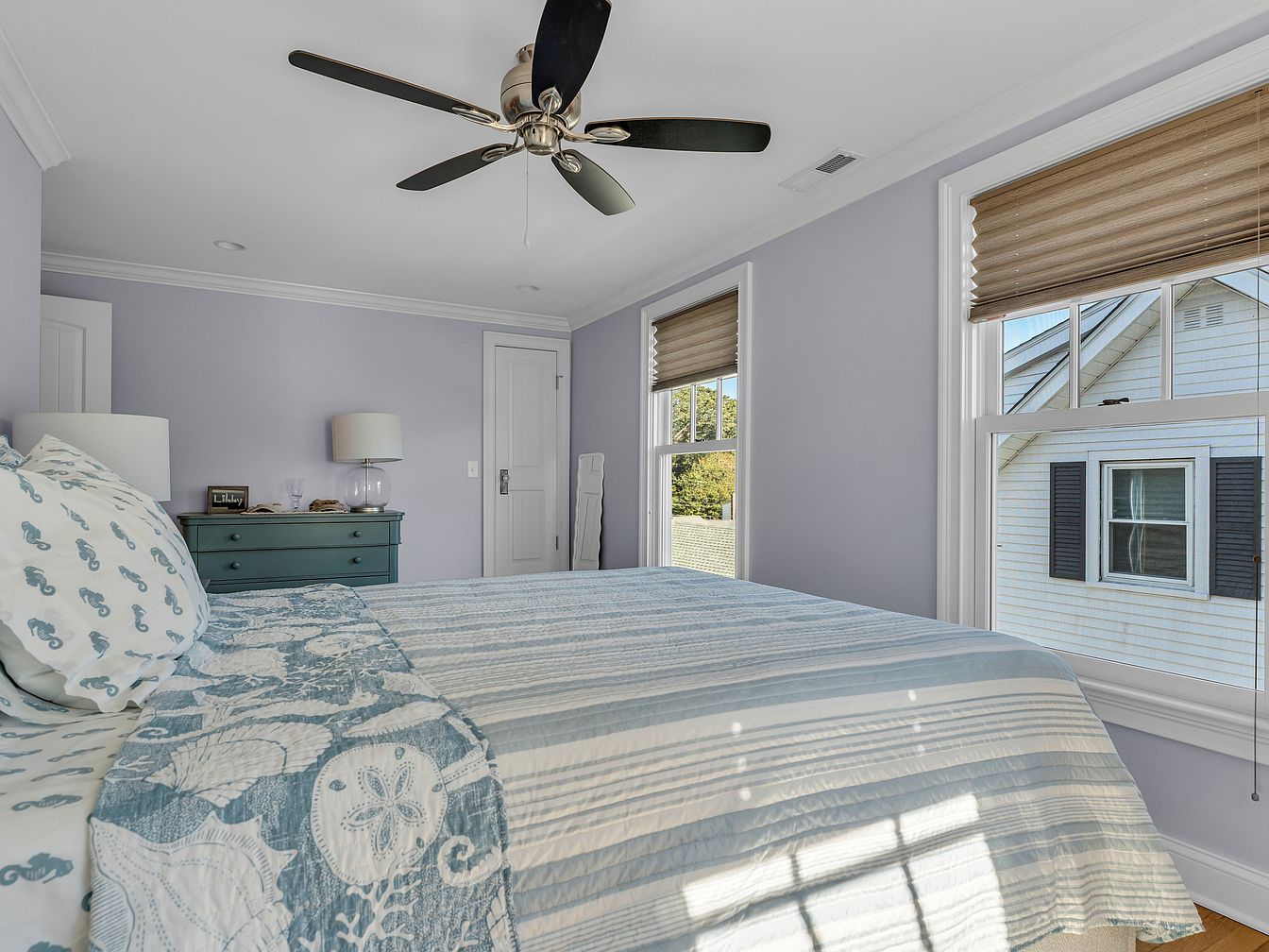 A serene bedroom showcases light lavender walls paired with crisp white trim and ceiling, lending an airy, tranquil atmosphere. The bed features blue and white linens with a seashell and seahorse motif, evoking a coastal theme. Natural light streams in through two large windows with beige pleated blinds, brightening the space. Opposite the bed, a teal dresser is topped with a table lamp and small decorative objects, providing both storage and subtle color contrast. Above, a modern ceiling fan with black blades and a brushed metal base offers cooling comfort, complementing the understated elegance of the room. Hardwood flooring adds warmth and classic appeal.
