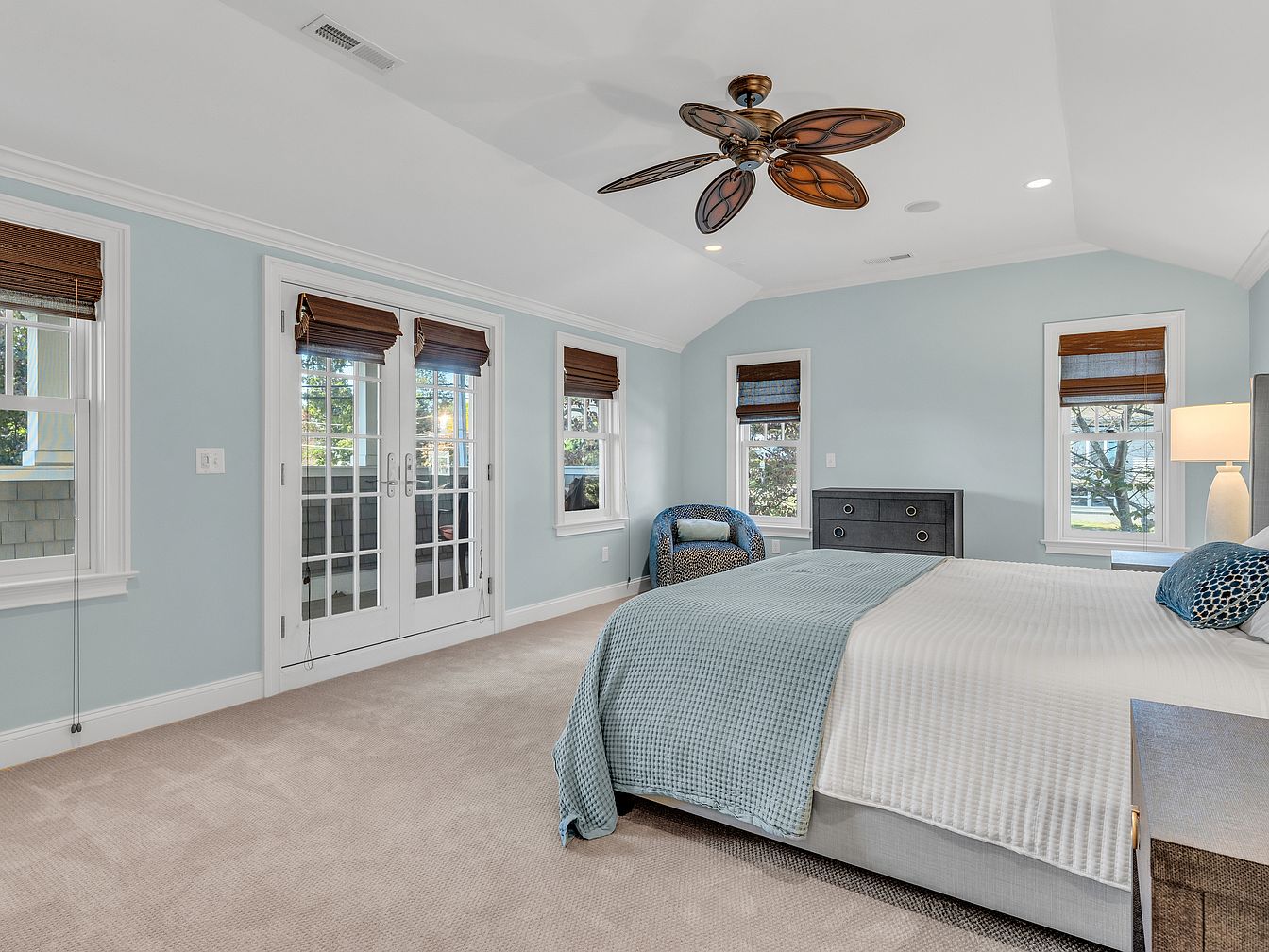 A spacious bedroom filled with natural light from four windows, each bordered with white trim and adorned with earthy brown blinds. Soft sky-blue walls create a calm atmosphere, contrasting gently against a plush tan carpet. The bed features a light gray upholstered frame and layered bedding in white and blue hues, accented by textured throw pillows. A dark chest of drawers and a cozy armchair sit opposite the bed. French doors with glass inserts lead to an exterior area, enhancing the room’s open feel. A unique ceiling fan with leaf-shaped blades adds a tropical touch to the otherwise soft, elegant decor.