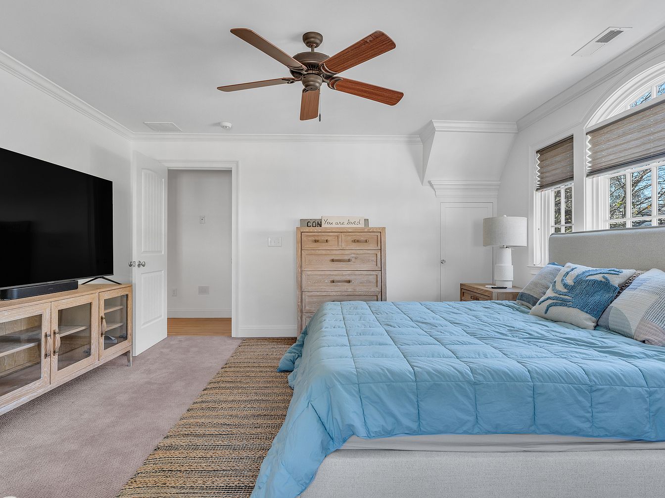 A serene bedroom featuring a soft blue and beige color scheme, anchored by a bed with a light gray headboard and a sky-blue comforter paired with accent pillows. Natural light pours in from two large arched windows with white trim and taupe shades. Pale carpeting stretches across the floor, topped by a natural fiber area rug. On one wall sits a wooden console supporting a large flat-screen TV. A matching wooden dresser and nightstand add warmth and texture, while a lamp with a white shade offers a calming glow. The ceiling fan features wooden blades, adding a hint of classic charm.