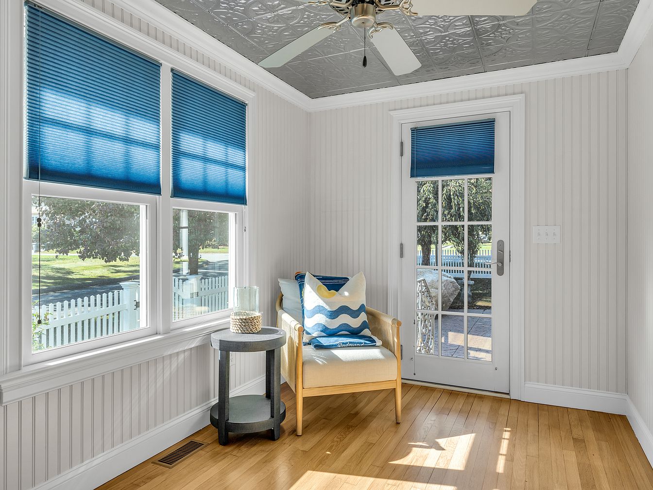 A bright and inviting corner features a door with multiple glass panes that opens onto a patio, flanked by two large windows. All three have vibrant blue pleated blinds, providing a pop of color against crisp white tongue-and-groove walls. The ceiling has ornate tin tiles painted silver, accented by a white ceiling fan with decorative brass hardware. Light wood flooring enhances the airy feel, and a minimalist wooden armchair with a wave-patterned cushion sits beside a small, round black side table holding a glass hurricane candle. Outside, a white picket fence and lush greenery are visible, evoking a peaceful, classic American home atmosphere.
