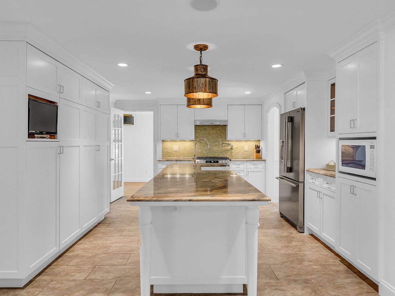 A spacious, contemporary kitchen features a large central island with a polished marble countertop, surrounded by sleek white cabinetry that extends to the ceiling. The floor is covered in warm, light brown tiles that coordinate with the natural tones of the countertops. Stainless steel appliances, including a refrigerator and built-in microwave, are situated along the right wall, while a compact television is neatly built into the cabinetry on the left. A rustic, cylindrical pendant light with a distressed metal finish hangs above the island, casting a cozy glow. Subtle under-cabinet lighting highlights a beige tile backsplash behind the sink and stove, adding warmth to the space.