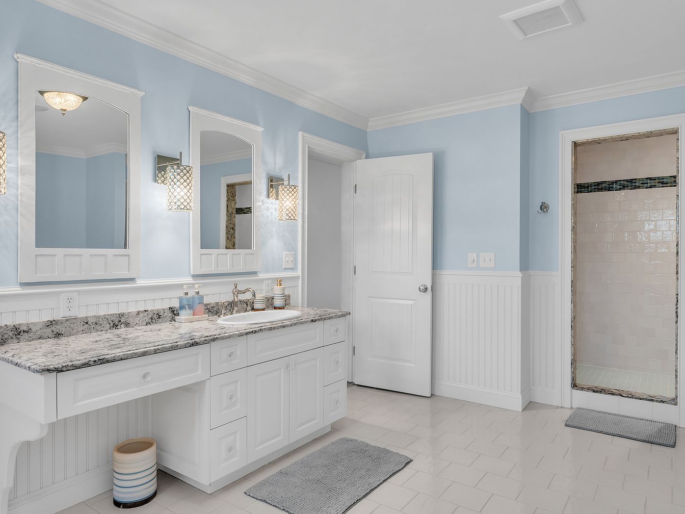 Spacious bathroom featuring a long granite countertop with white cabinetry and drawers beneath. Above the counter are two large framed mirrors, set against soft blue walls accented with crisp white wainscoting. Elegant wall sconces with intricate lantern-style shades flank the mirrors, casting patterned light. The flooring is glossy, light-colored tile, offering a clean, airy feel that matches the contemporary yet classic aesthetic. A separate walk-in shower with glazed tiles and a decorative trim is visible to the right, while plush grey bath mats and carefully coordinated accessories enhance the soothing, organized atmosphere of the room.