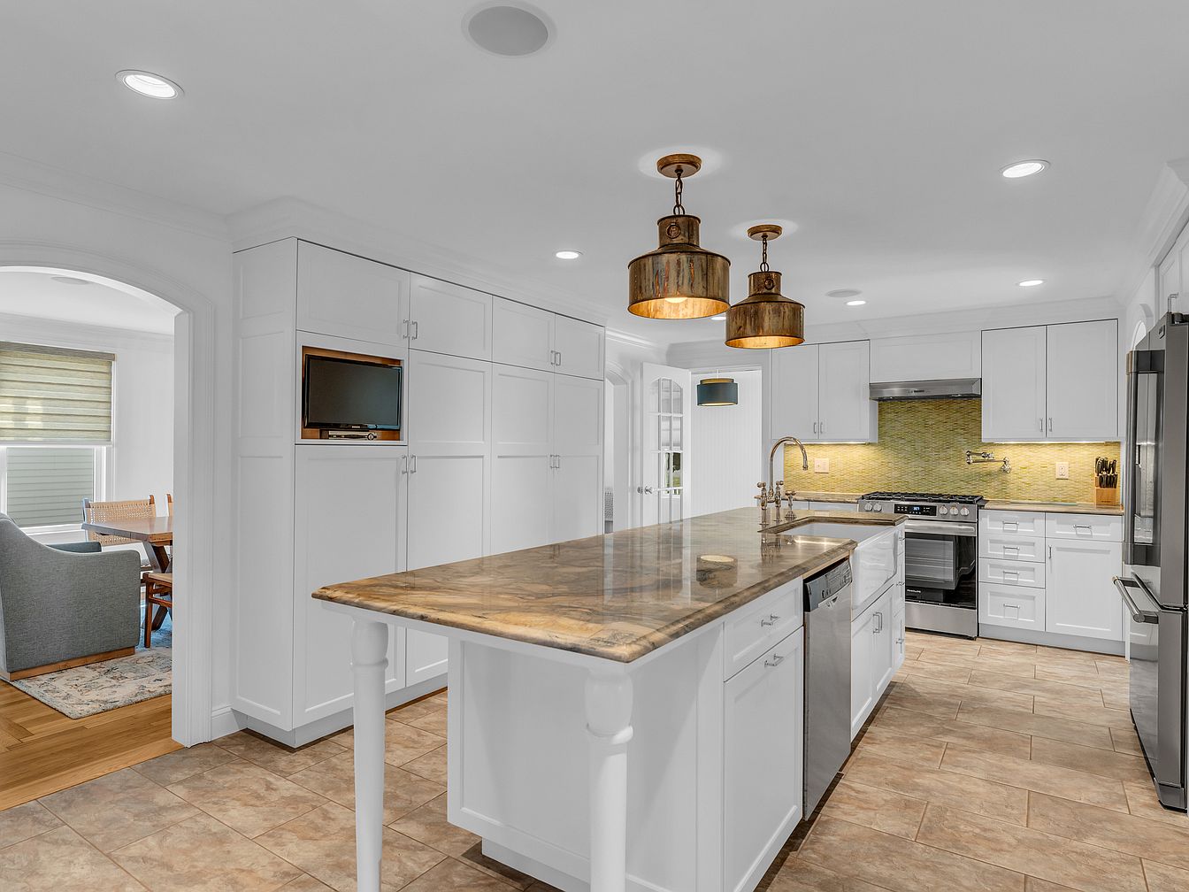 A spacious kitchen features a large central island with a marble countertop and classic white cabinetry. Two rustic bronze pendant lights hang above the island, bringing warmth to the otherwise cool color scheme. The backsplash behind the stove area is a muted green mosaic tile, adding subtle texture. Stainless steel appliances, including a range and refrigerator, blend seamlessly with the cabinetry. To the left, an open archway leads to a seating area with upholstered chairs and a wooden dining table. The porcelain floor tiles are tan, complementing the earthy hues of the countertops and pendant lights, creating an inviting yet sophisticated ambiance.