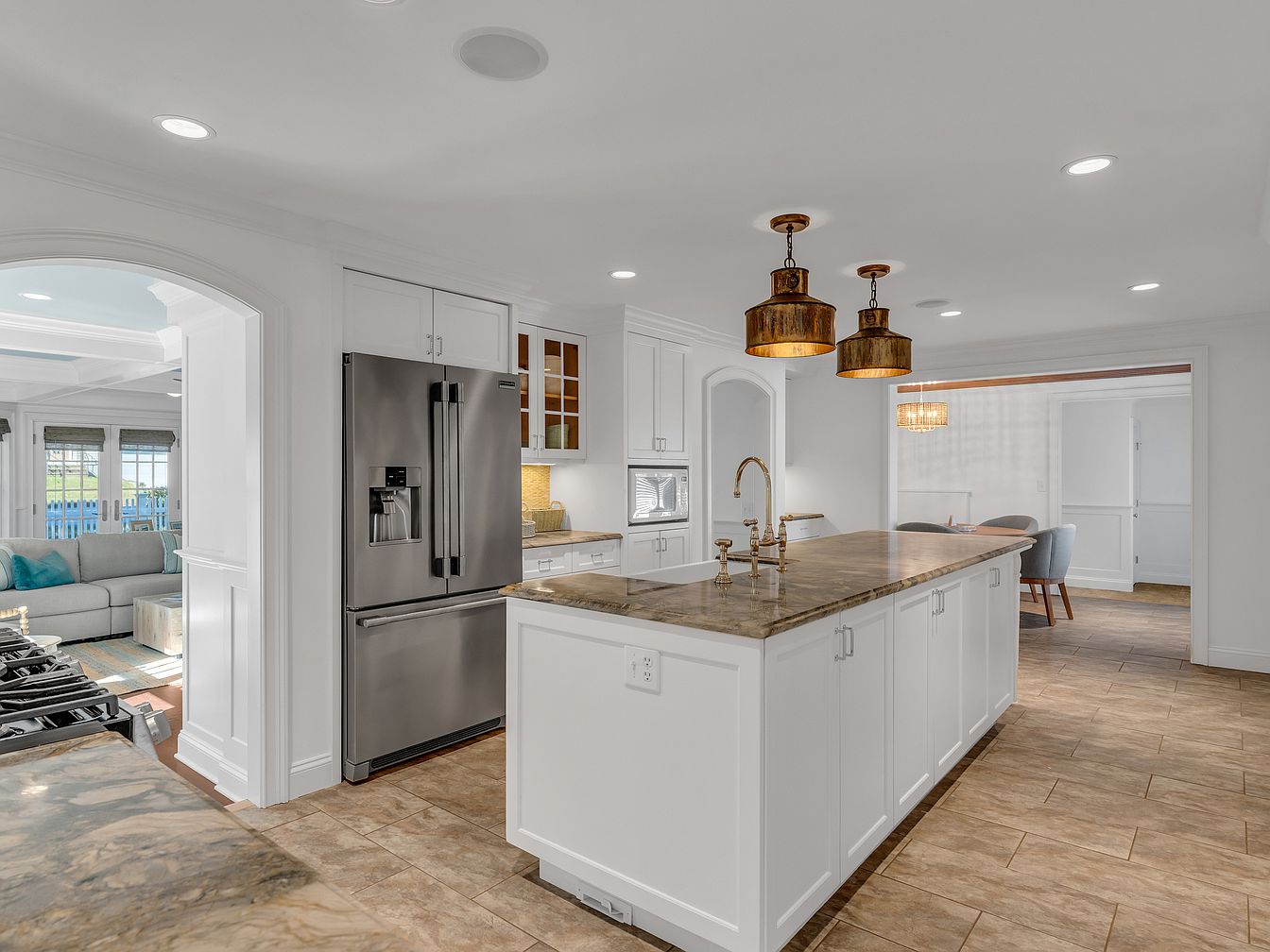 A spacious kitchen features a large center island with a marbled countertop in earthy tones and white cabinetry beneath. Overhead, three striking bronze pendant lights provide a warm, ambient glow. The perimeter of the kitchen is lined with additional white cabinets and a stainless steel French door refrigerator, complemented by built-in appliances. Earthy beige floor tiles add warmth and continuity. Wide archways connect the kitchen to a living area with a gray sectional and turquoise cushions, and a dining space with upholstered chairs and another elegant light fixture visible in the background, creating a cohesive, open-concept layout.