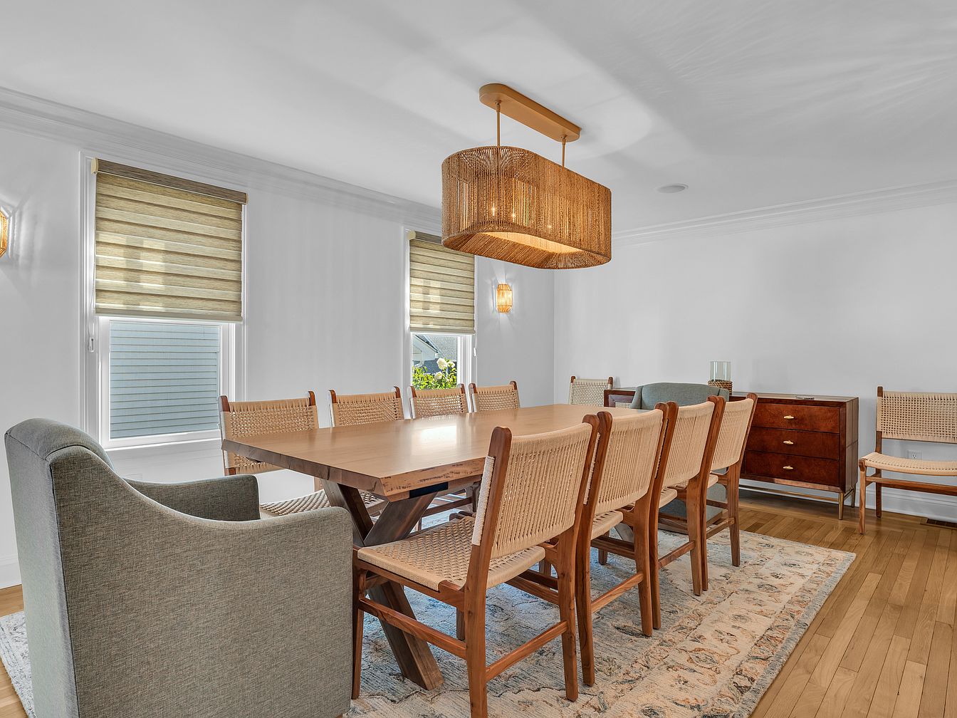 A long rectangular wooden dining table is paired with eight woven-back chairs and two upholstered armchairs at either end, creating an inviting setting for gatherings. The room features pale wood floors and is anchored by a subtle, patterned area rug beneath the table. The walls are painted in crisp white, providing a clean backdrop. Windows lined with neutral-toned Roman shades allow light to gently filter in, while a large rectangular wicker pendant chandelier hangs above, adding warmth and texture. A vintage-style wooden sideboard and matching bench provide additional storage and seating, completing the cohesive, understated mid-century look.