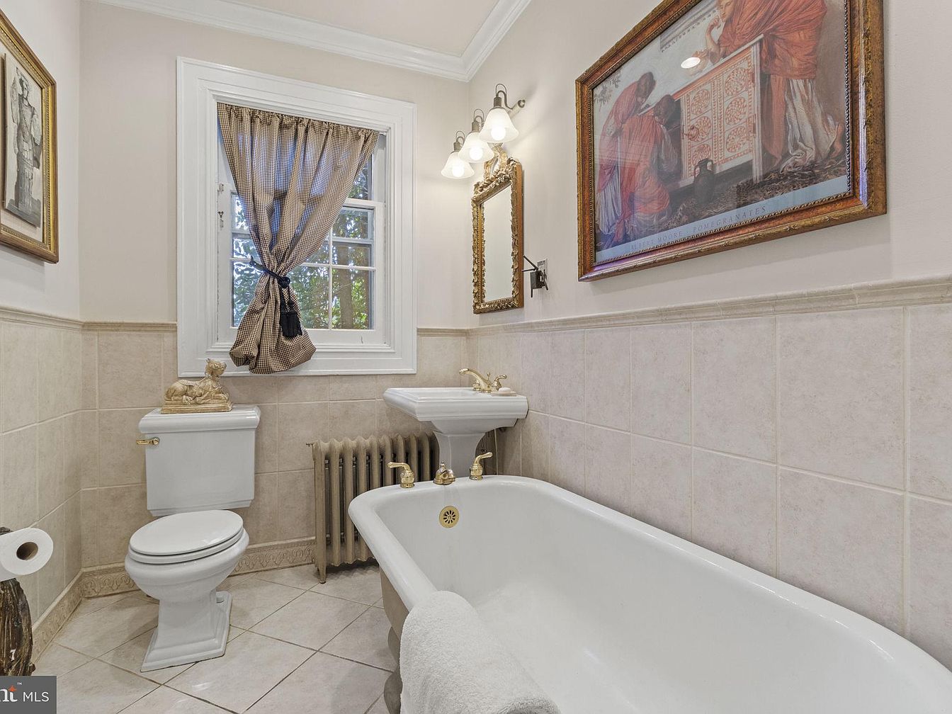 A charming bathroom features a white freestanding soaking tub with golden fixtures in the foreground. The nearby white porcelain toilet and pedestal sink are both accented by brass hardware. The creamy beige ceramic tile covers the lower half of the walls and floor, providing a classic, refined feel, while the upper walls are painted a soft neutral tone. Over the sink hangs an ornate framed mirror, and above it, two vintage-style wall sconces provide warm lighting. A small window is dressed with brown checkered curtains tied in the center. Large framed artworks and a decorative statuette atop the toilet enhance the room’s traditional appeal.